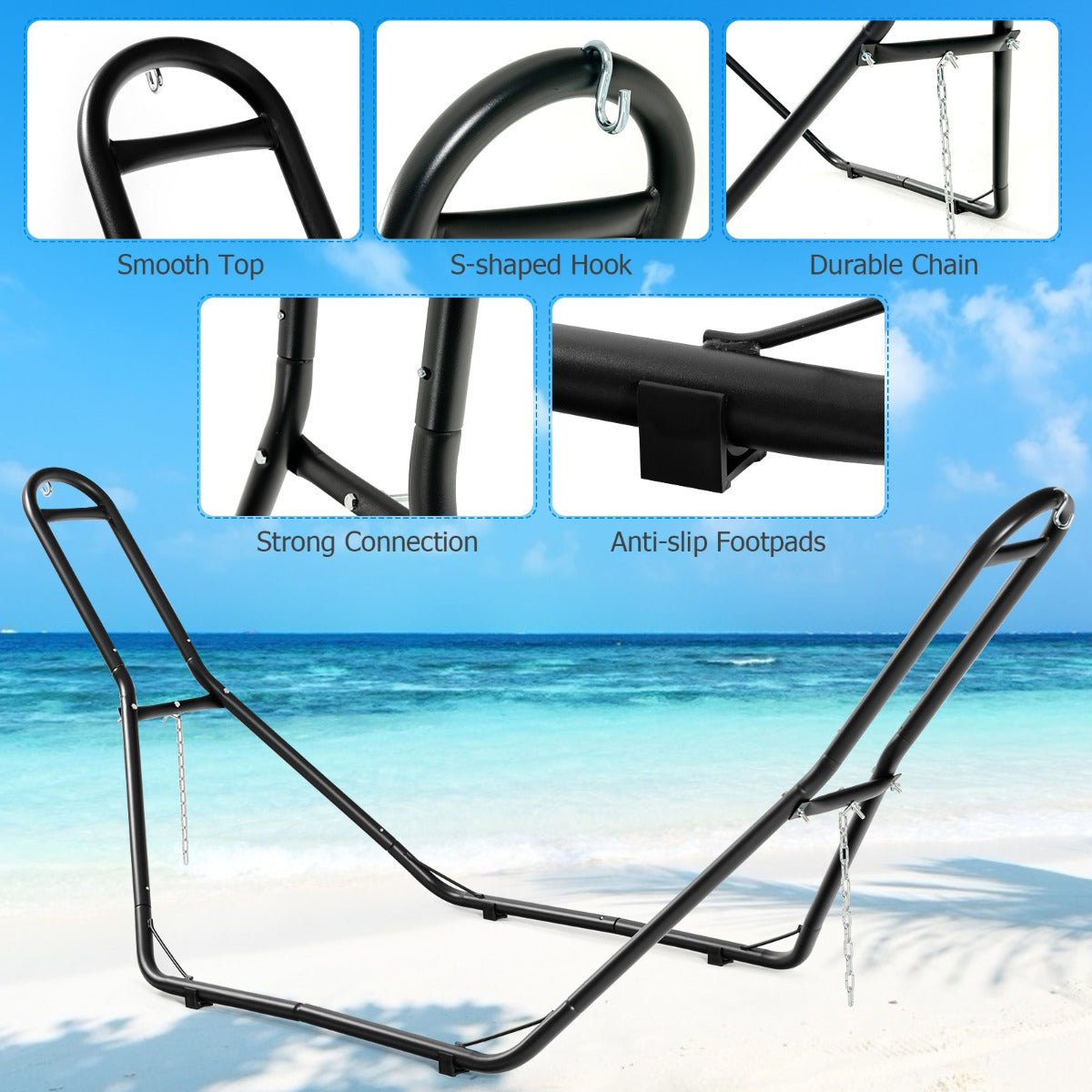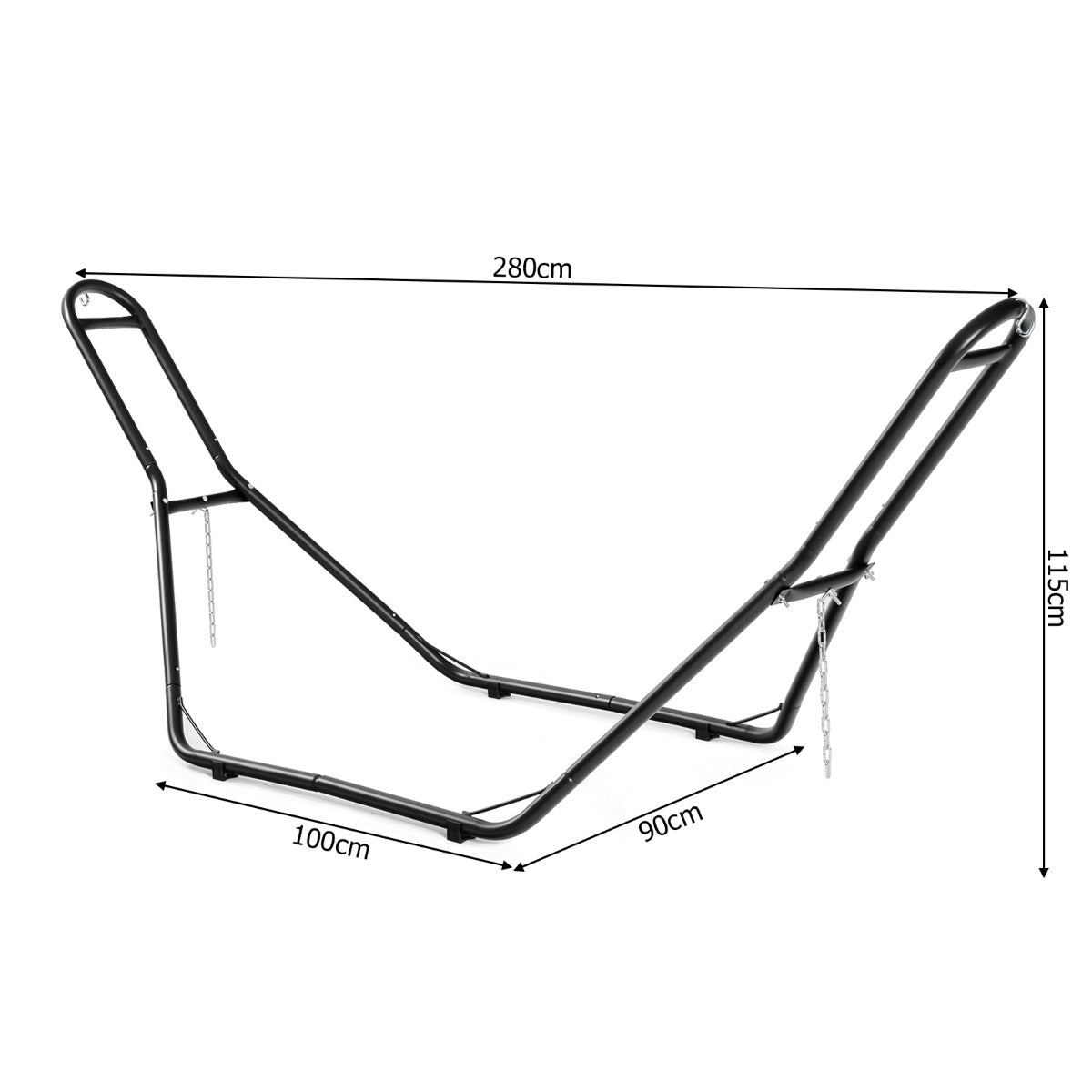 Our hammock stand provides you with convenience when you desire to have a rest on the hammock. With 2 adjustable chains and 2 s-hooks, it is able to hang different kinds of hammocks. The stand made of premium steel is weather-resistant and rust-resistant, enabling you to use it for a long time. Thus, it is ideal for patio, courtyard, garden and deck. Featuring heavy duty steel frame, it has a weight capacity up 150kg, which is safe for you to use. Besides, plastic pads keep it stable and protect the floor from scratching. Besides, its light weight and detachable design allow you to carry it to any destination. Detailed instruction and all necessary accessories simplify the installation process. Don’t hesitate to place an order! Bullet Point: Suitable for Different Hammocks: Our hammock stand with2 adjustable chains and 2 s-hooksis able to fit different kinds of hammocks, such as curved hammock, Brazilian hammock and spreader bar. Besides, you can choose different hanging methods to fix your hammock ranging from 9-10.5ft. Durable & Weather-Resistant Material: Our stand made of powder-coated steel is durable, rust-resistant and weather-resistant, which ensures its long service life. High-quality material makes it ideal for patio, courtyard, garden, deck and other outdoor places. Heavy Duty Steel Frame: Heavy duty steel frame keeps it stable and sturdy during the using process, which perfectly protects users’ safety. Our stand can hold up to 330lbs, making it suitable for both kids and adults. In addition, 4 anti-slip foot pads protect your floor from scratching. Light Weight & Thoughtful Design: Our light-weight stand enables you to place and move it wherever you like. Round corner prevents you from being hurt. Apart from that, its detachable design enables you to detach it effortlessly and store it in any box or corner according to your needs. Quick & Easy Assembly: The stand is equipped with complete accessories and easy-to-understand manual, which helps you to conveniently install it in a short time without difficulty. You can assemble it easily to hang up your hammock when there are no trees. Features: 2 adjustable chains and 2 s-hooks to fit different hammocks Suitable for many places, including patio, courtyard, garden, deck and bedroom Powder-coated steel makes it rust-resistant and durable Heavy-duty steel frame ensures high stability and sturdiness Plastic pads benefit the floor protection Lightweight and detachable structure allow you to move and store it easily Easy-to-understand instruction and complete accessories make it easy to assemble Specifications: Color: Black Material: Steel Overall dimension: 280cm x 90cm x 115cm (L x W x H) Net weight: 14.5kg Load capacity: 150kg Package Includes: 1 x Hammock Stand 1 x Instruction Box Qty:1(May vary by batch)