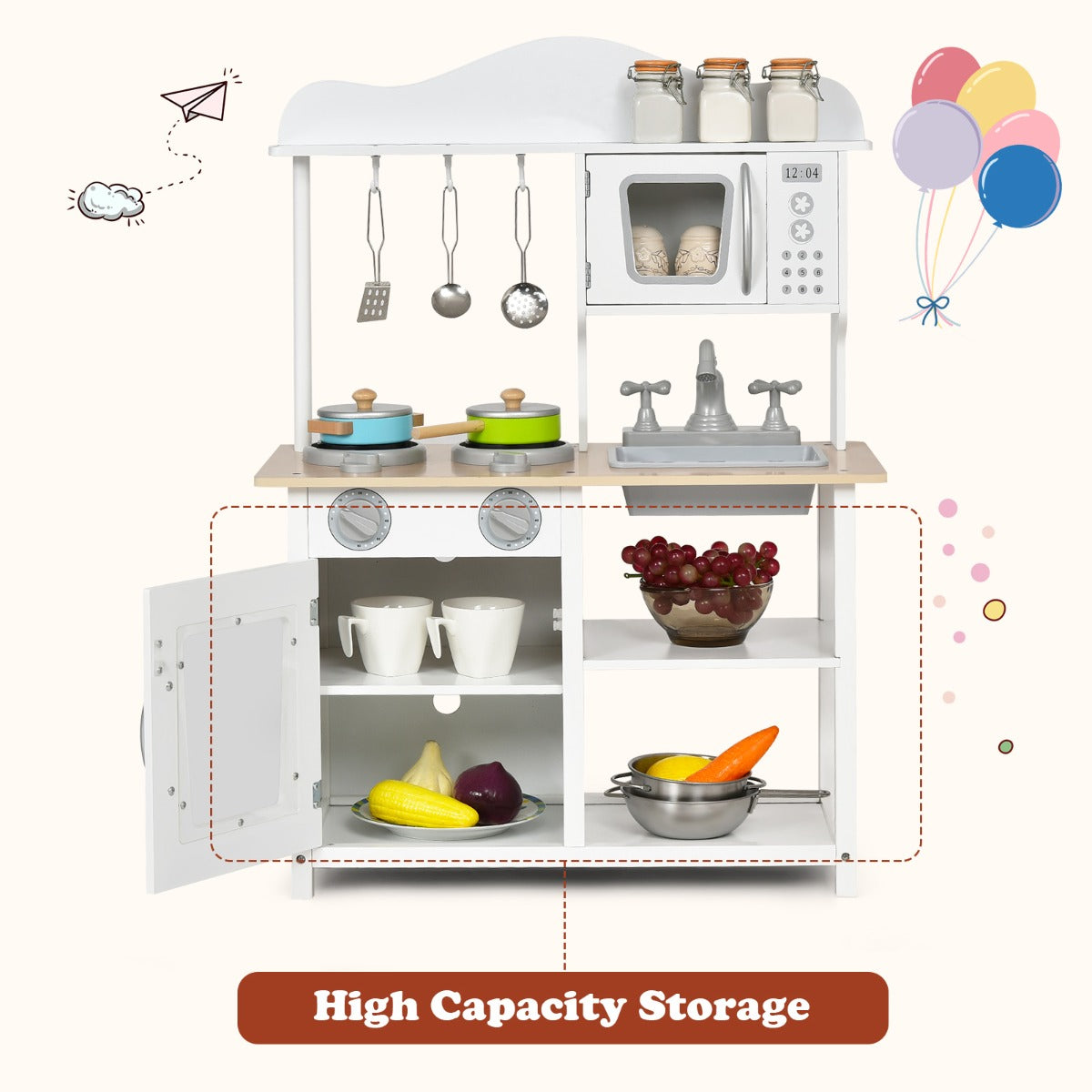 Safe & Sturdy Materials: Crafted with durable MDF material, our kitchen cooking toy is sturdy and durable for long time use. Smooth round edges effectively prevent accidental bumping. Besides, the materials and paints are 100% safe for the little ones, which has passed the ASTM standard.
