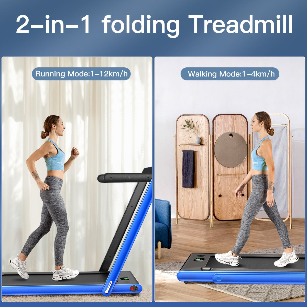 2 in 1 Running & Walking Treadmill: Compared to ordinary treadmills, our 2-in-1 treadmill has 2 modes to meet your different sports needs, so you can easily have a healthy body. When the riser is folded, it can be used as an under desk treadmill at a speed of 1-4km/h, so you can do other things while walking. When the handrail is raised, the running speed is 1-12km/h and you can run to reach your fitness goal.