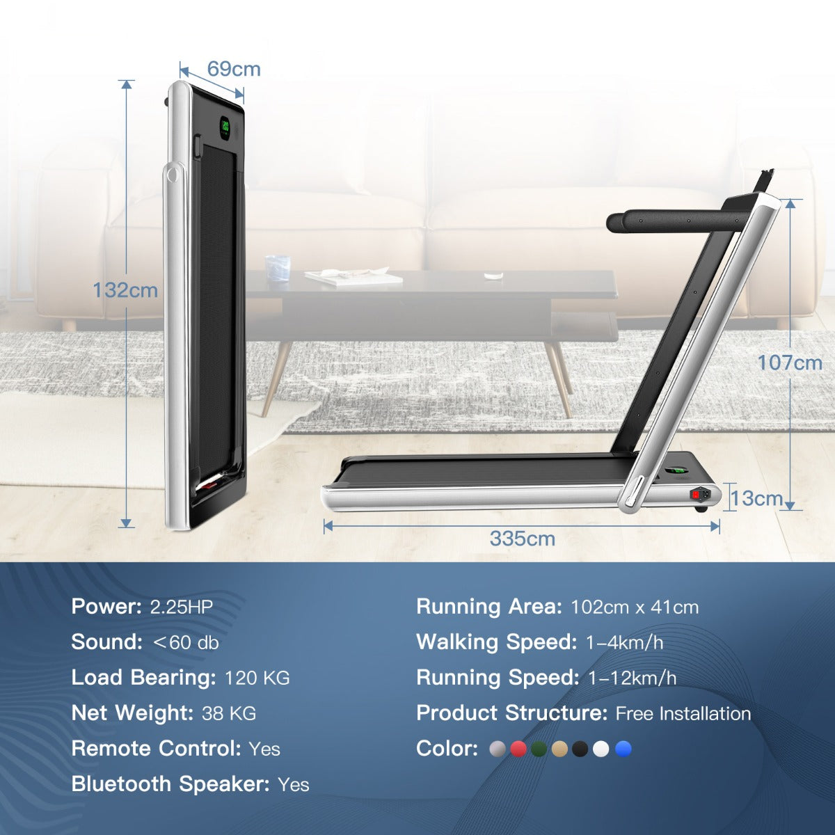 Our innovative 2-in-1 folding treadmill has 2 sport modes that can be used as a running treadmill and an under desk walking treadmill. You can use it for walking, jogging and running, which is very suitable for home, office and gym. With a powerful 2.25 HP ultra-quiet motor, it provides you with a quiet and comfortable sports environment without disturbing others. 5-layer non-slip and shock-absorbing running belt provides effective cushioning for your back, joints, muscles, knees and ankles. A versatile LED display monitors your movement data in real time. You can connect the treadmill to your phone through Bluetooth and play music while you are exercising. In addition, it is equipped with a remote control and APP control for better training. The compact design and transport wheels make this treadmill easy to fold, move and store. Start exercising now and burn your calories!
