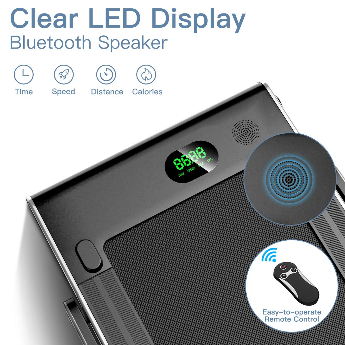 Bluetooth Speaker & Remote Control & Safety Key: The treadmill can be connected to your electronic equipment through the Bluetooth audio speaker, which means you can listen to music while running. The remote controller can change the running speed to avoid accidents. The safety key ensures that you stop immediately in an emergency to protect you during exercise.