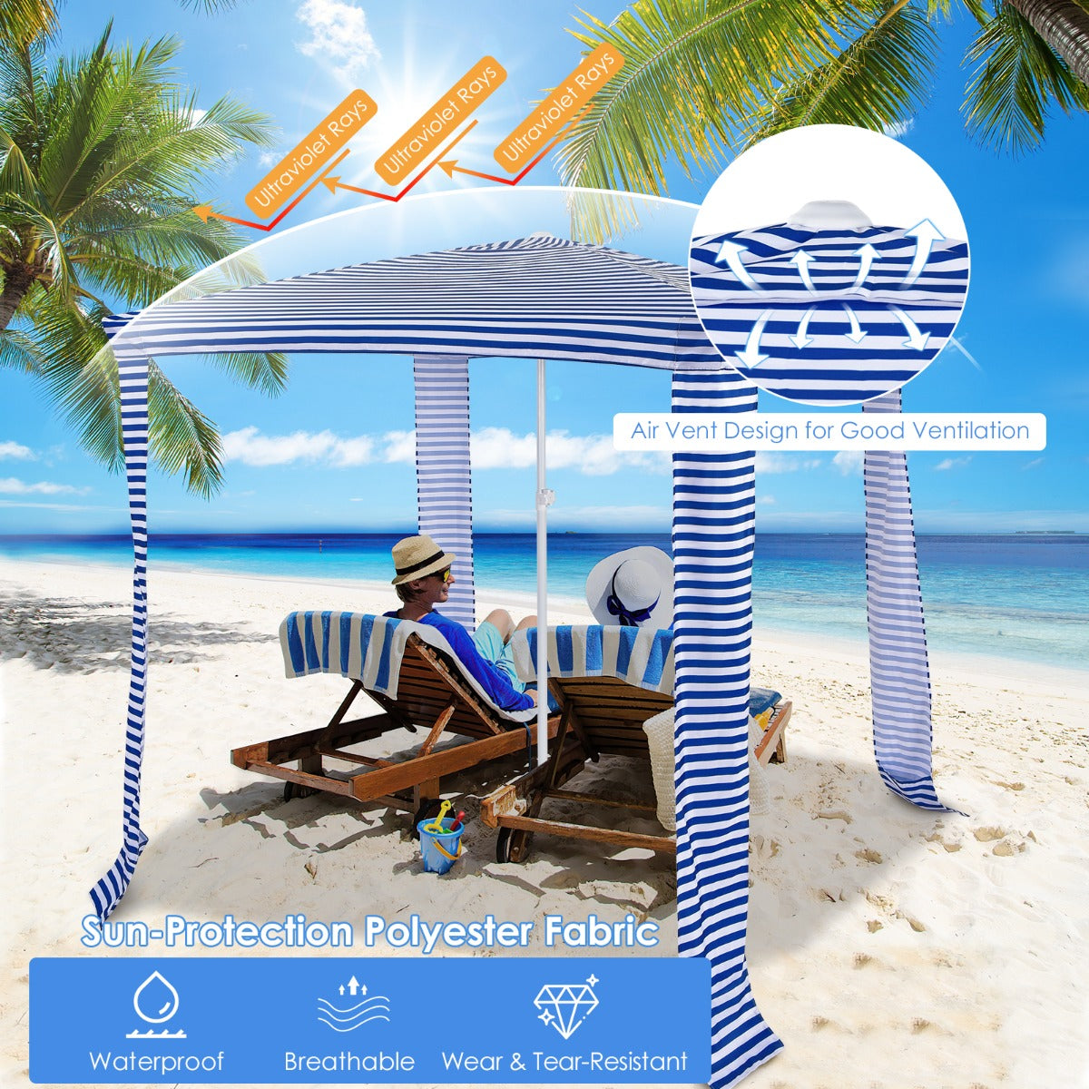 Large Shade & Detachable Sidewall: The beach cabana measures 4 sq meters of shade, providing sufficient rest area for couples, family, or friends to enjoy parties. Moreover, there exists a sidewall that can be detached by zippers, allowing you to enjoy maximum sun protection and extra privacy.