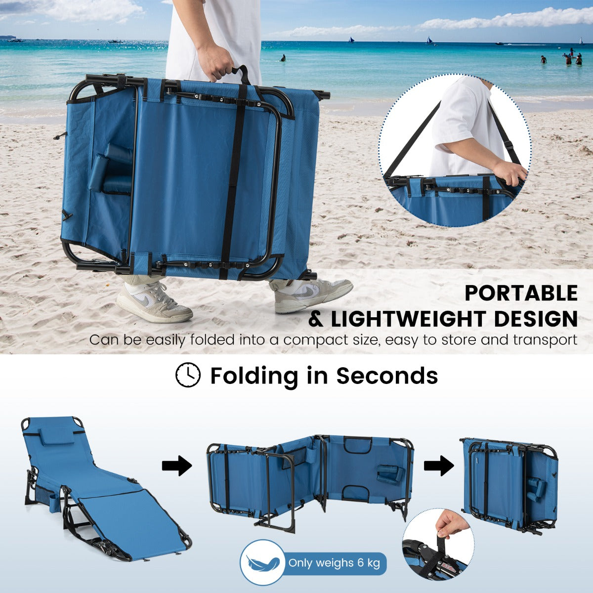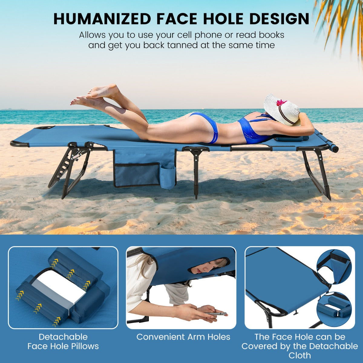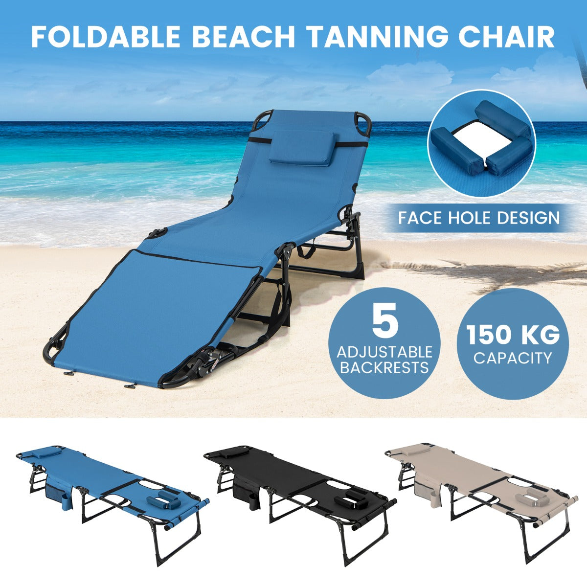 Enjoy Your Outdoor Sunbathing & Tanning with Our Lounge Chair! Our foldable beach lounge chair measures 154-194 x 60 x 84-34 cm (L x W x H) and can be easily folded into a compact size, which can be a perfect companion for your beach vacation, camping trip, and patio lounge. And designed with convenience in mind, this chair features a humanized face hole design and arm holes, allowing you to seamlessly use your cell phone or enjoy a good book while getting that perfect tan. More than that, there exists a 5-position adjustable backrest and a 2-position adjustable footrest, allowing you to find a perfect angle for relaxation. The folding chair is made of thick 600D oxford fabric and a stable U-shaped metal frame, which is sturdy and durable enough to guarantee long-term outdoor use. Other than that, the lounge requires no installation and you can quickly fold it, which is easy to store and transport. The portable lounge chair is ideal for indoor and outdoor use, and you can take it anywhere you want, such as the beach, patio, poolside, lawn, garden, deck, office, campsite, etc. Bullet Point: Humanized Face Hole Design: The beach lounge chair is designed with a face hole and convenient armholes, allowing you to use your cell phone or read books and get your back tanned at the same time. Moreover, the face hole pillows are detachable and the face hole can be covered by a detachable cloth. Therefore, whether lying face up or lying face down, it can meet your needs. Adjustable Recliner & Ergonomic Design: The backrest can be adjusted in 5 positions and the footrest in 2 positions, so you can sit up, recline, or flat down to enjoy sunbathing, tanning, reading, listening to music, or rest. Moreover, the ergonomic tanning chair can naturally fit the human body for better relaxation. Durable & Stable Construction: The folding lounge chair adopts thick 600D oxford fabric, which is not only wear and tear-resistant for long-term use but also breathable and quick-drying for a comfortable lying experience. In addition, it is supported by a stable U-shaped metal frame, providing strong support and ensuring a large loading capacity of 180 kg. Portable & Lightweight Design: The lounge recliner can be easily folded into a compact size, making it convenient for storage and transportation. Whether you want to store it against a wall, under your sofa, or in the trunk of your car for your next trip, this chair won't take up much space. With a weight of only 6 kg, it's lightweight and easy to carry. Versatile Application: This multipurpose lounge chair is suitable for various indoor and outdoor activities. Whether you're sunbathing, tanning, camping, or traveling, it will be your perfect companion. (Notice: Please do not expose the chair to the sun for a long time and fold it down when not in use to prolong its service life.) Features: The face hole design allows you to lie on your stomach and place your face The arm hole design allows you to place arms under the chair for more comfort The face hole can be covered by a cloth, meeting different needs The backrest can be adjusted in different positions, meeting different purposes Made of thick 600D oxford fabric, wear-resistant, waterproof, and breathable The metal frame with powder-coated surfaces is rustproof and durable The U-shaped metal frame and sturdy triangular frame ensure good stability The non-slip and non-sink feet on the bottom add friction and prevent slipping Can be folded and unfolded in seconds, easy to store and transport Suitable for sunbathing, tanning, camping, lounging, fishing, and more With a detachable headrest, providing comfy support for your head and neck The convenient storage pocket with classified storage keeps items within reach Specifications: Colour: Beige/Dark/Blue Material: Oxford Fabric, Metal Overall Dimensions:154-194 x 60 x 84-34 cm (L x W x H) Pillow Size:30 x 16 x 4 cm (L x W x H) Folding Size:80 x 60 x 18 cm (L x W x H) Size of the Face Hole:16 x 13 cm (L x W) Size of the Arm Hole:8.5" x 4.5" (L x W) Weight Capacity:180 kg Net Weight:6 kg Package includes: 1 x Foldable Beach Lounge Chair 1 x User's Manual Box Qty:1(May vary by batch)