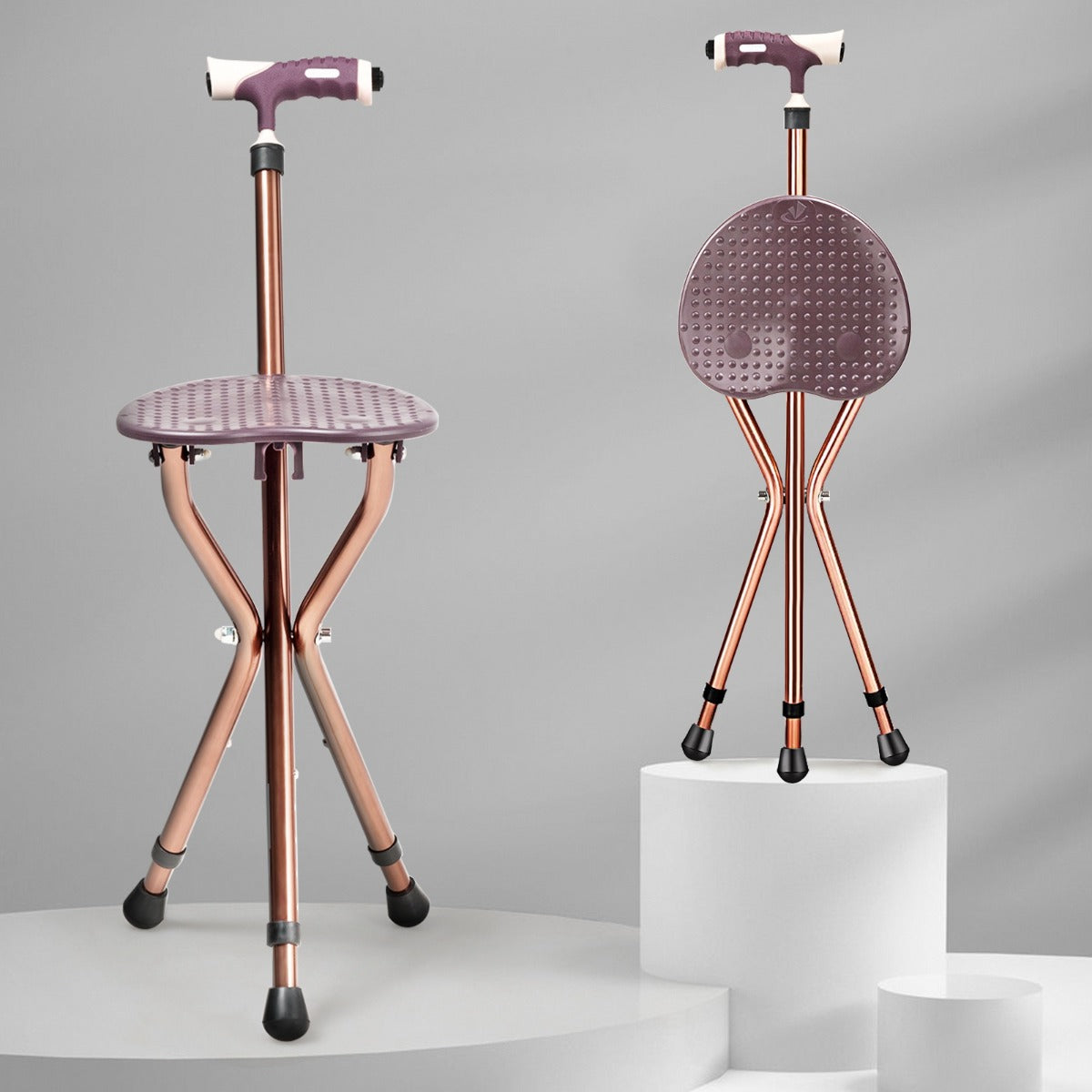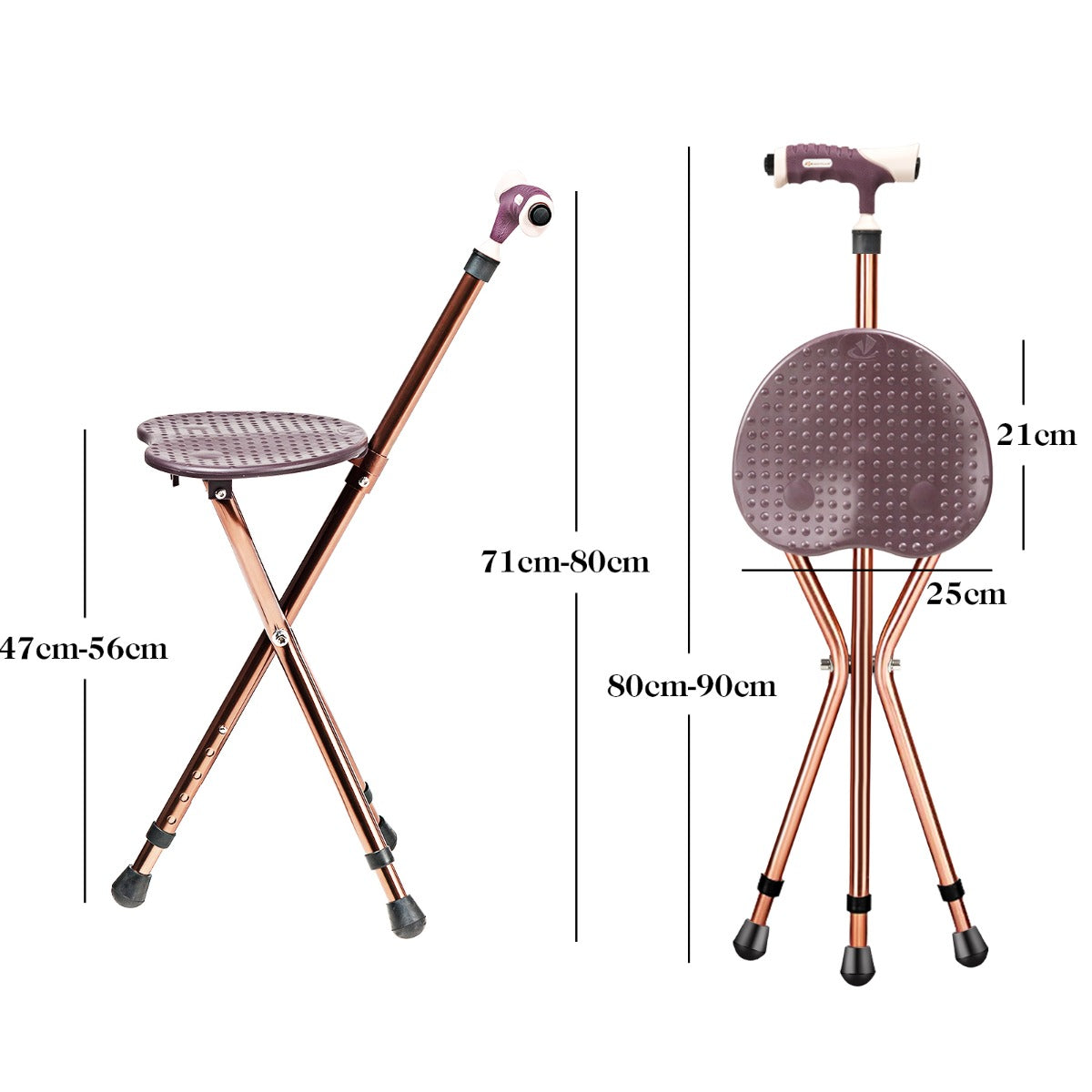 Heavy-duty Cane Seat: Made of premium robust aluminum alloy, this folding cane legs has good wear resistance and load bearing up to 100kg, but only weigh 1.25kg. Tripod design & non-slip footpad’s increases stability to sit when open and it can also function as a sturdy support cane when closed.