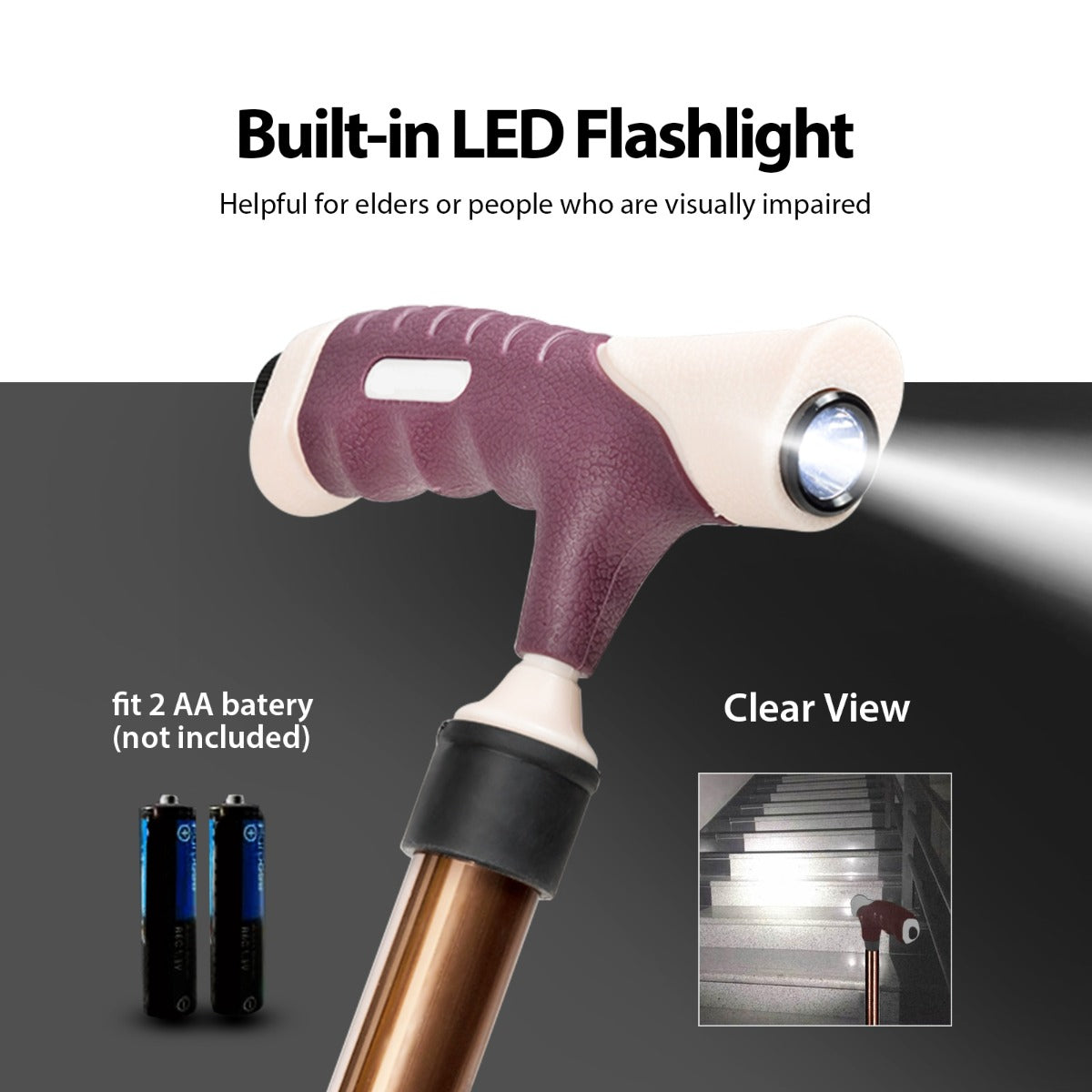 Ergonomic Handle with LED Light: The ergonomic handle feels smooth as golf club, which provides a comfortable grip and can effectively relieve the fatigue of hand and wrist. The built-in LED light is easy to operate and powered by 2 AA batteries (not included), ensuring the elderly to walk safely at night.