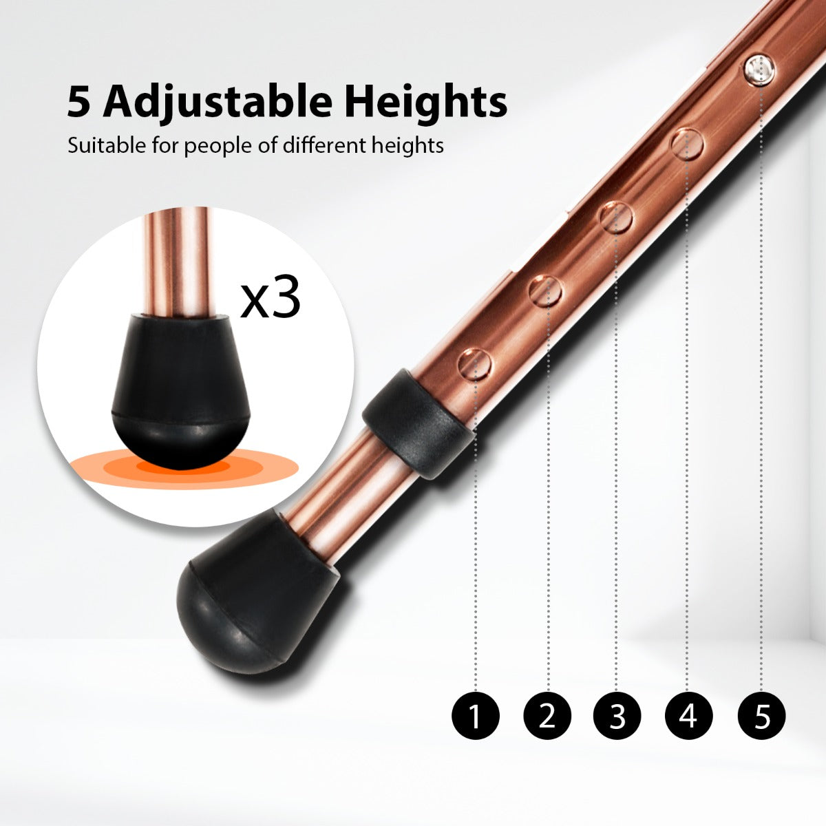 5-level Adjustable Height: This walking stick with adjustable height is suitable for people of different figures. You can adjust it to your favorite height when you walk for the maximum comforts. Quick folding mechanism allows it to be folded into a compact size for easy transportation and storage.