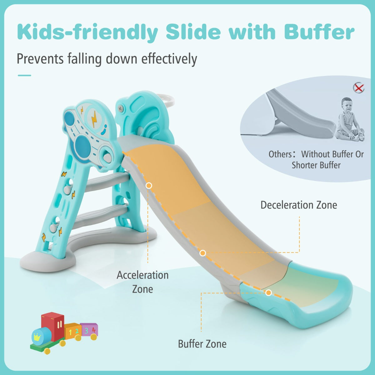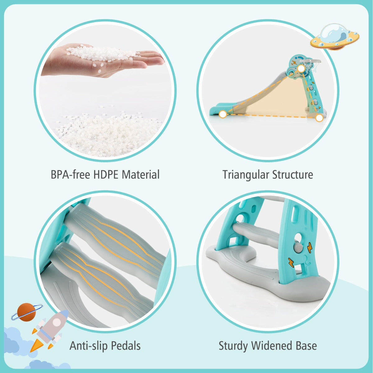 Do you want to keep your little one busy playing? Why not try this 3-in-1 children slide. It has a wide slide, a basketball hoop and steps for sliding, basketball playing or climbing, so that your sweetie will enjoy playing for hours. What's more, made of high-quality HDPE material, our play slide can accompany kids for a long time and do no harm to kids' health. To better ensure kid's safety, we also equip it with anti-slip pedals and burr-free edges. Meanwhile, EN71 certification guarantees overall security. Bullet Point: 3-in-1 Kids Slide Set: The toddler slide is designed with a slideway to slide, a basketball hoop with a ball to shoot and climbing steps to climb. Thus, kids can have much fun and develop their motor skills. Besides, the unique UFO patterns and bright colors will catch your little one's eyes. Recommended age: 18+ months old. Safe Slideway & Pedals: Thanks to the safe slideway with considerate buffer, our slide toy set enables kids to play smoothly and land safely. Plus, designed with stable widened base and non-slip pedals, our indoor kids slide is sturdy, safe to climb and not easy to wobble. Superior HDPE Material: We have selected HDPE material that is BPA-free and odorless to protect kids' delicate skin and safety. Rounded edges and burr-free surface also prevent accidental bumping or scratching. The whole slide is approved by EN71 for excellent security. Easy to Fold & Store: With the folding devices, our play slide can be easily folded into a compact size, which is easy to store in any corner to save limited space. And its folded size is 133 cm x 81 cm x 43 cm(L x W x H). You can use it in living room, kindergarten, nursery and other places. Kids-friendly Design: The triangular structure ensures outstanding stability. The slide supports up to 44 lbs. Easy-to-grip nuts help you to easily install the slide. Furthermore, the smooth surface can be quickly wiped clean. Features: Provides 3 different playing methods(sliding, climbing or shooting) The scientific slideway can be divided into 3 parts( accelerate zone, deceleration zone and buffer zone) Package includes a basketball and a pump BPA-free and durable HDPE material ensures your kid's safety Round and burr-free corners are safe for kids to touch Smooth surface for easy cleaning Better than others with unsafe pedals and no base EN71 certification for safe use Easy-to-install design saves time and energy Folding design for space-saving storage Great for the kid's room, living room, play room or kindergarten Specifications: Colour: Blue/ Pink Material: HDPE + PP Folded Dimension: 147 cm x 81 cm x 73 cm (L x W x H) Unfolded Dimension: 133 cm x 81 cm x 43 cm (L x W x H) Recommended Age: 18+ Months Old Weight Capacity: 20 kg Net Weight: 6.5 kg Package includes: 1 x Kids Slide 1 x Basketball 1 x Air Pump 1 x User Manual Box Qty:1(May vary by batch)