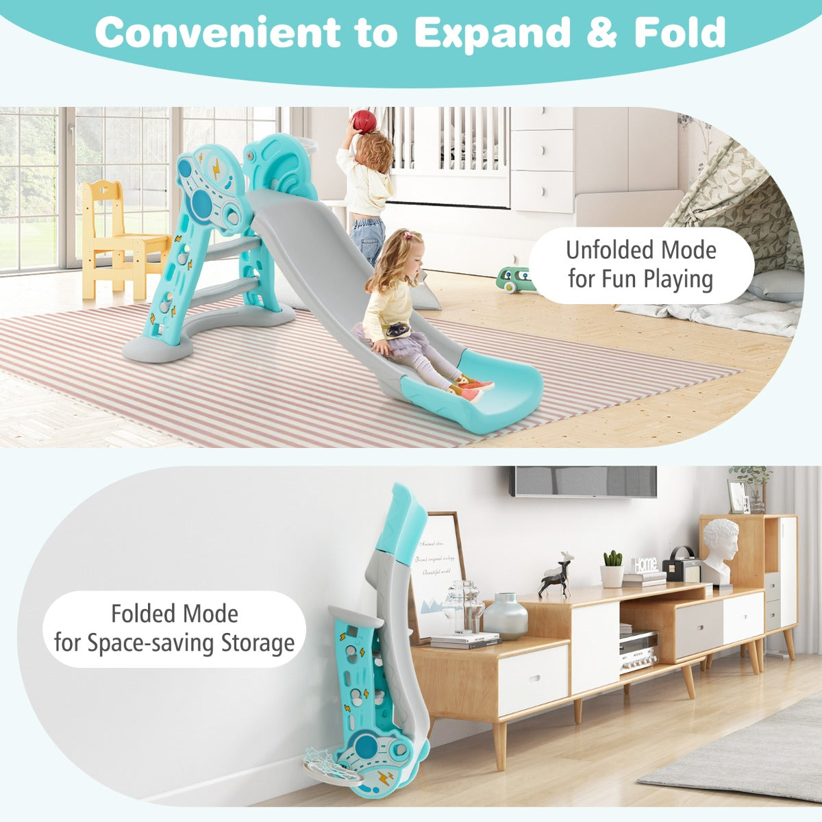 NNECW Folding Slide Playset with Basketball Hoop and Small Basketball for Kids-Blue