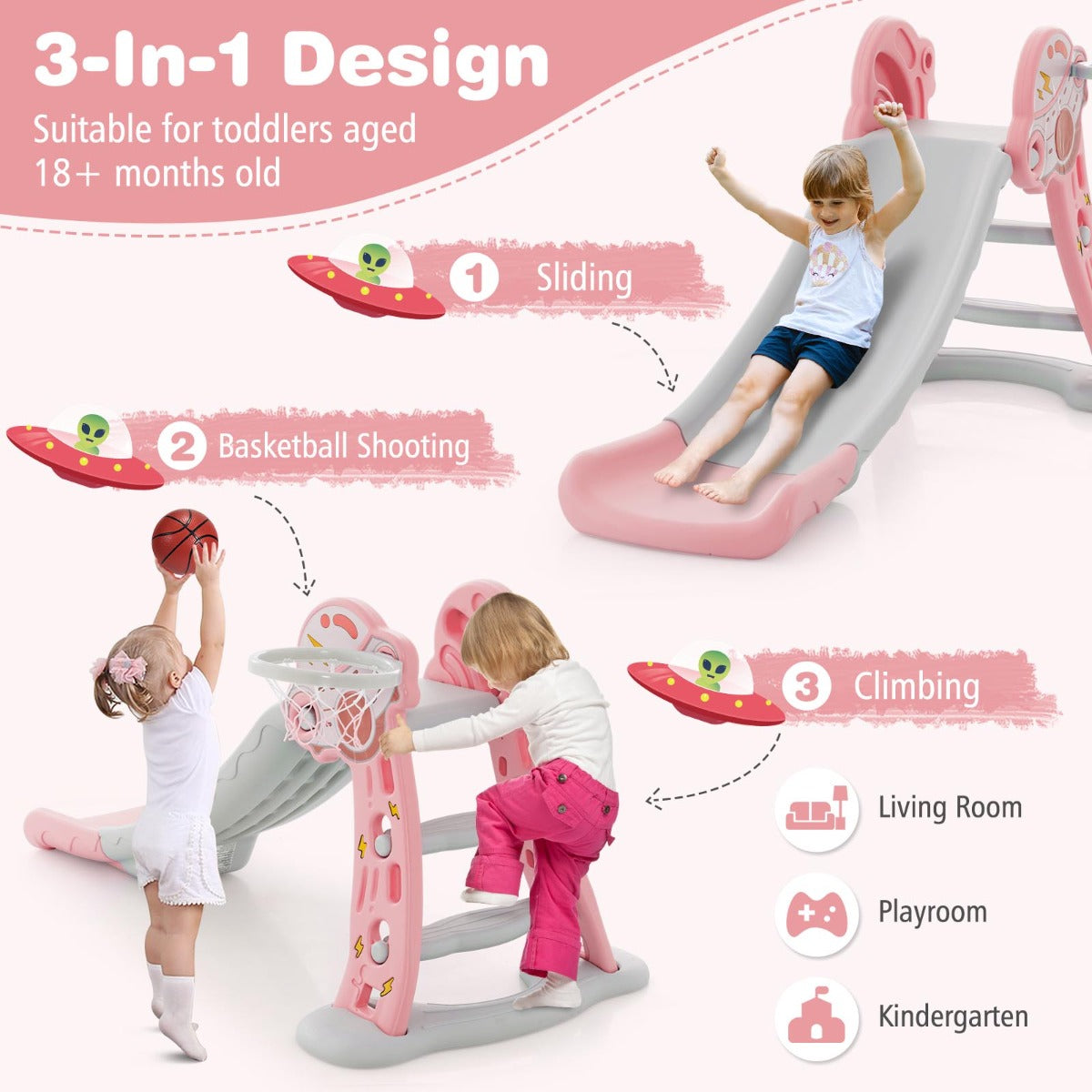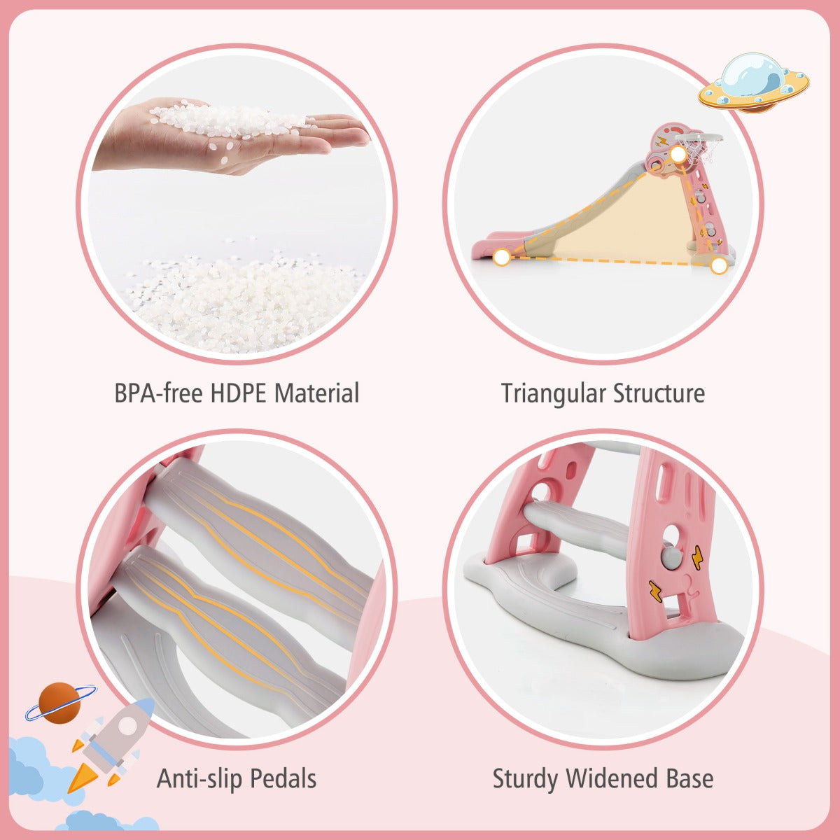 NNECW Folding Slide Playset with Basketball Hoop and Small Basketball for Kids-Pink