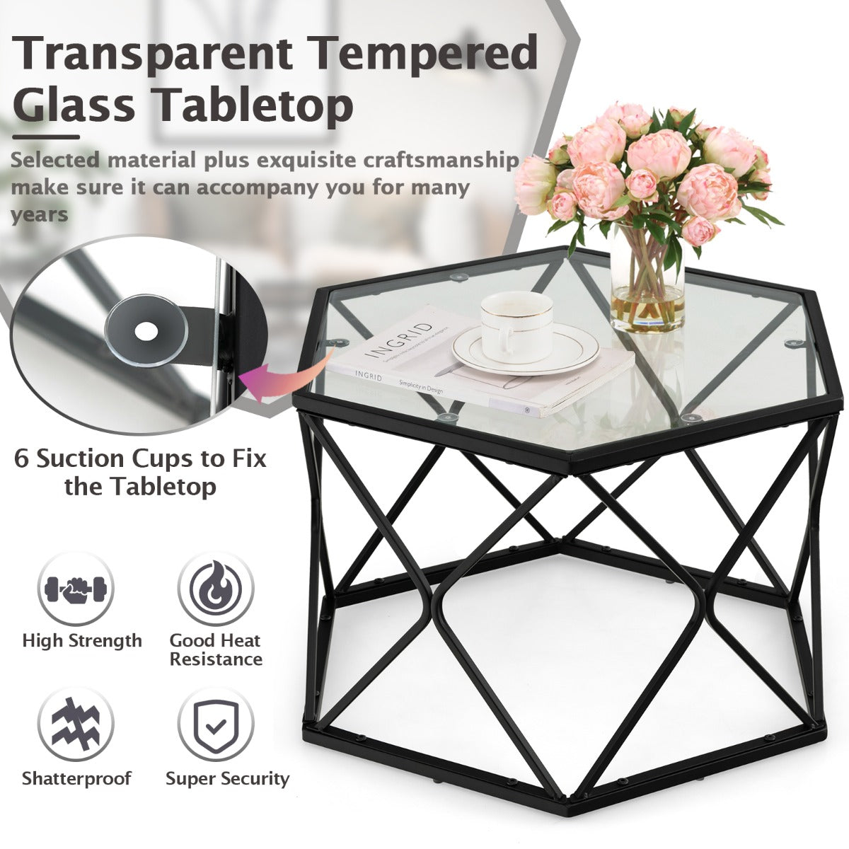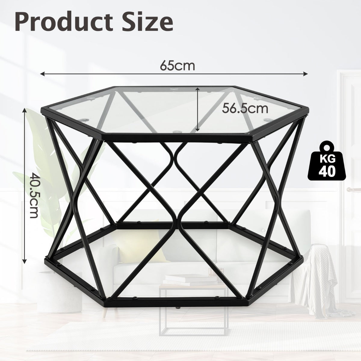 Unique Geometric Design: The modern central table stands out with its hexagonal element, delivering the perfect visual effects and giving your home a lively atmosphere. Besides, the combination of sleek lines, crystal tempered glass tabletop and classic black steel frame adds a refined sensation to your room.