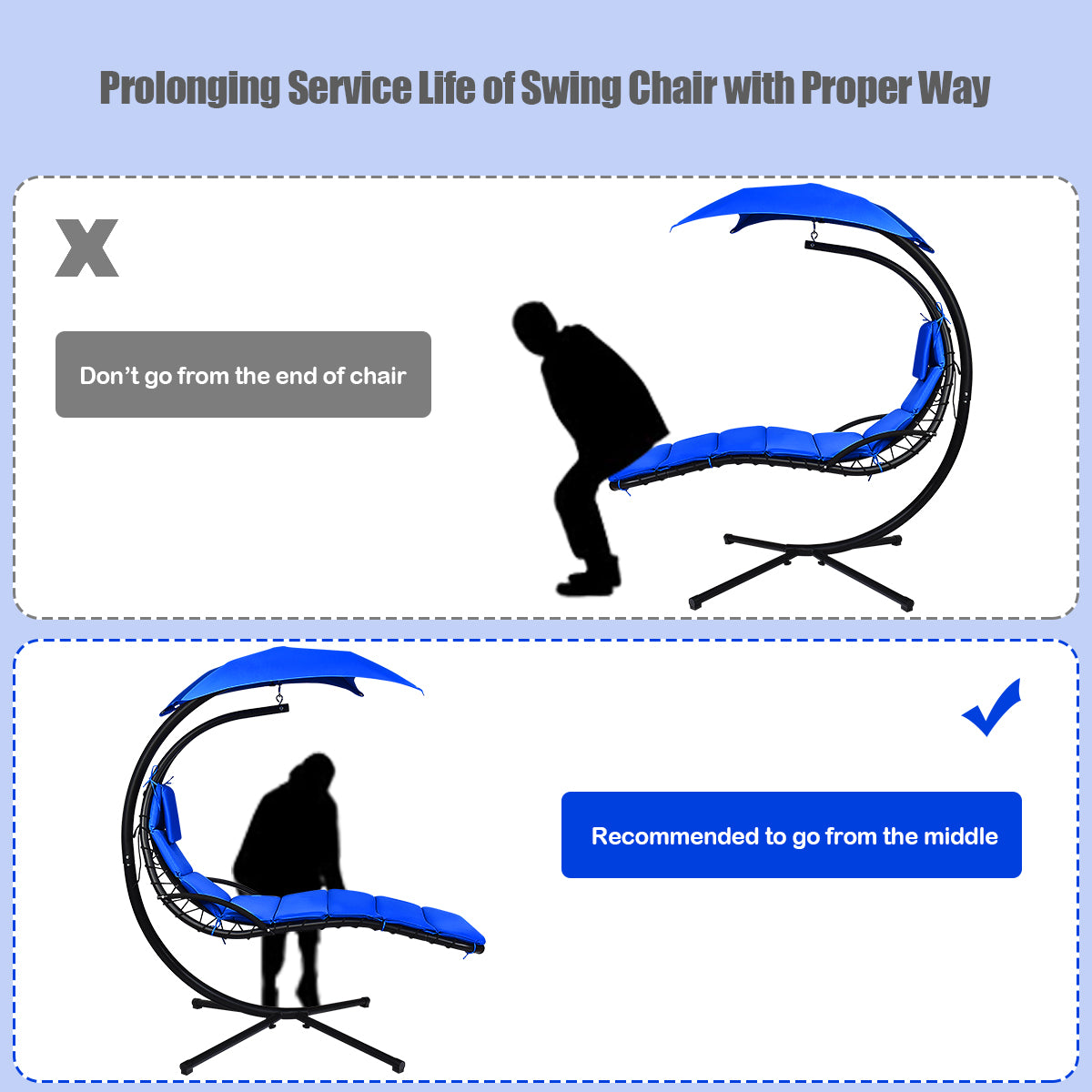 This hammock chair with superior quality can provide comfort and style to your garden, patio or backyard. Crafted with a thick stainless steel frame, this hammock chair is sturdy for long-term use. The legs with anti-slip foot cover of the lounge chair are designed with an X-shape to ensure stability. Attached with a soft cushion and pillow, the hanging lounge will add extra comfort to you. And the ergonomic chair will provide you with hours of rest. The chair also features a canopy to shade you from the sun and the canopy can be adjusted with different angles. You will get the greatest extent of comfort if you have this hammock chair. Bullet Point: 【 High-Quality Material】 Our hanging Chaise Chair is crafted of a heavy powder-coated steel frame, which ensures firmness and durable usage. The bottom X structure increases stability, and there are non-slip foot covers to prevent ground scratches. 【Ergonomic Design & Soft Cushion】Ergonomic design fully fits the human body curve and relieves lumbar pressure. In addition, the soft cushion is very thick and fixed by a fixing strap. Plus, the material is fabric, breathable and highly elastic, which can increase the comfort experience. 【Adjustable Canopy & Sun-protective】 Our lounger chair’s canopy is made of thickened polyester, which provides sun shade when you lie on the hanging chair. A hammock chair with a canopy and the angle can be adjusted to meet your different needs. 【Stylish Appearance for Multiple Usage】Fashionable appearance can perfectly match daily use. It means that this hammock lounger chair is suitable for various occasions and you can put it in your garden, swimming pool, balcony, etc. 【Easy to Assemble & Clean】It comes with an assembly manual and required accessories which allow you to assemble the hammock chair quickly. In addition, the detachable cushion cover is easy to clean and maintain for a better use experience. Features: Heavy powder-coated steel frame ensures sturdiness and durability Good air permeability and high resilience seat fabric Attached with cushion and built-in pillow to add extra comfort Non-slip plastic caps on foot protect floors The ergonomic design of the hammock fits the curve of your body Removable and adjustable shade canopy to keep cool Hanging chairs can be used both outdoors and indoors Cushion can be removed for cleaning Armrest with soft sponge on the two sides Easy to assemble according to instructions Specifications: Colour: Blue/Navy/Orange Material: Steel Frame, Fabric, Polyester Dimension: 73.5''L x 43''W x 79''H Product Weight: 73.5 lbs Weight Capacity: 330 lbs Package Includes: 1 x Hammock 1 x Cushion 1 x Instruction Box Qty:1(May vary by batch)
