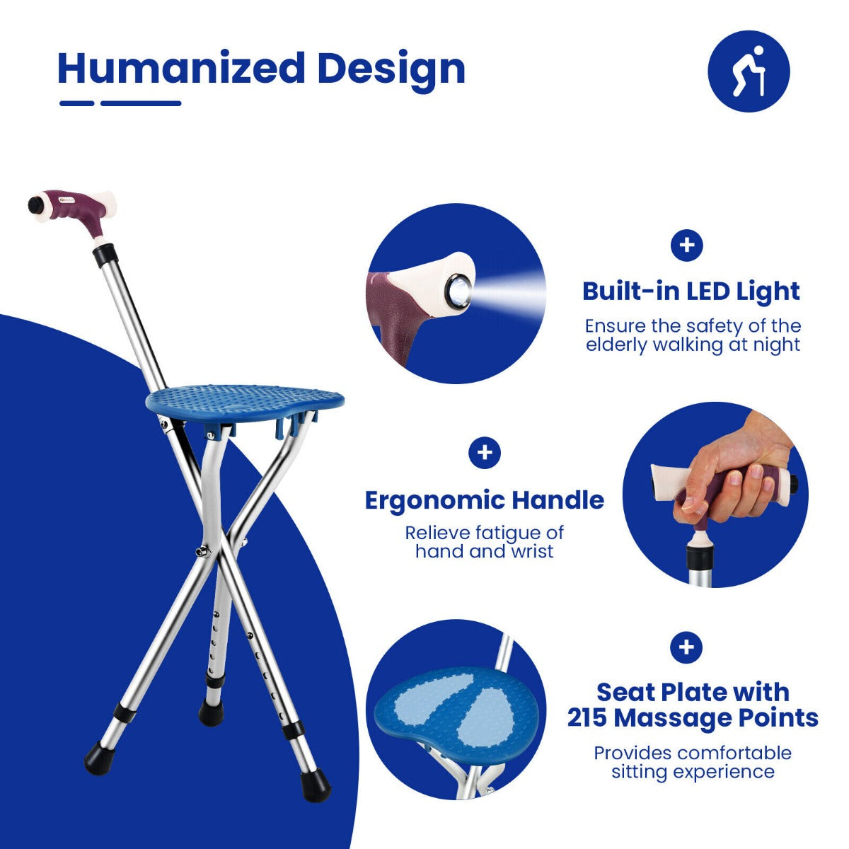 NNECW Height Adjustable Folding Massage Cane Seat Walking Stick with LED Light-Blue