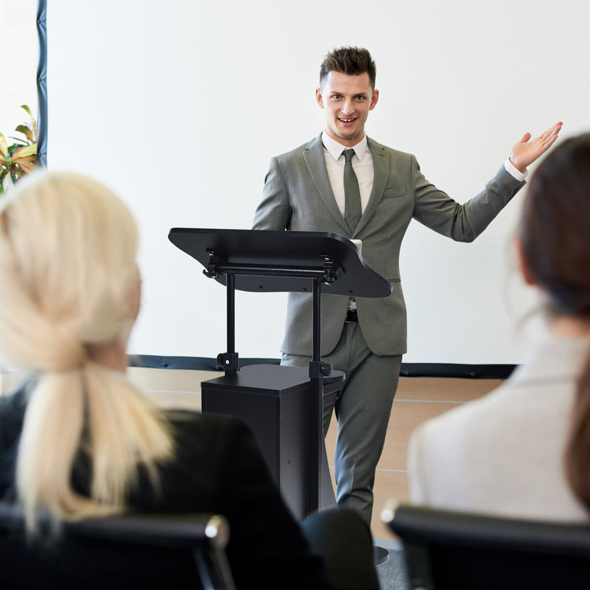 Are you looking for a desk that can stand or sit freely for increased productivity at home or in the office? This sit-to-stand laptop desk is your wise choice. The height of the desk is adjustable from 72cm to 120cm by turning the knob, which brings you a lot of convenience in customizing your personal workspace. The tiltable desktop keeps monitors at eye level to minimize fatigue while adding extra storage space. There is also an anti-skid stripe to prevent items from falling. With an open shelf and 2 open compartments, the standing desk helps you organize your books, documents and office supplies. Thickened boards and heavy-duty steel frame make it stable and not easy to shake. Thanks to 4 smooth wheels(2 wheels are lockable), you can move it anywhere you want. Bullet Point: Ergonomic Height Adjustment: The height of this laptop stand can be adjusted from 72cm-120cm to meet your different needs. It allows you to switch between sitting and standing modes for a healthier working style. Moreover, you can tilt the desktop in the range of 0°-180°(Recommend 45°) to keep your eyes in a comfortable view. Large Work Space: Featured with 40cm wide and 55cm in long desktop, the sit-to-stand desk creates a spacious and efficient work area. The open shelf provides extra space to display cups and decorations. Additionally, 2 storage compartments accommodate a great amount of office supplies, such as books, files and more. The anti-skid stripe to prevent items from falling. Smooth Rolling Wheels: This laptop stand is designed with 4 universal wheels, which ensures outstanding mobility for easy movement. You can move it anywhere you want without effort as needed. Additionally, 2 wheels are lockable for safe placement and extra convenience. Modern Look for Multiple Scenes: The combination of modern style and functional utility enables the standing desk to be an ideal addition to your space. It blends with existing furniture and ornaments. And it can be used for work, study and lectures in the office, home and classroom. Features: Adjustable height improves your sitting or standing posture Wide desktop offers ample room for laptops and other necessities Open shelf and 2 open storage compartments for convenient storage Barrier stripe avoids accidental slipping of items Thickened boards and sturdy steel frames ensure durability Flexible wheels (2 lockable wheels for safety) make it easy to move anywhere Sleek look brings a touch of elegance to your home and office Specifications: Color: Black Material: MDF, engineered wood Overall dimension: 55cm x 40cm x 72-120cm(L x W x H) Net weight: 12kg Weight capacity of desktop: 15kg Package includes: 1 x Standing desk 1 x Instruction manual Box Qty:1(May vary by batch)