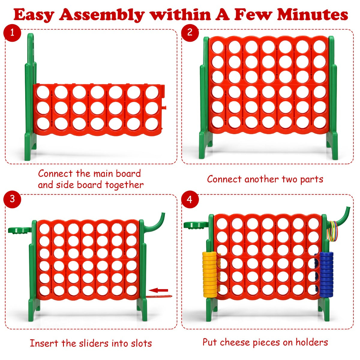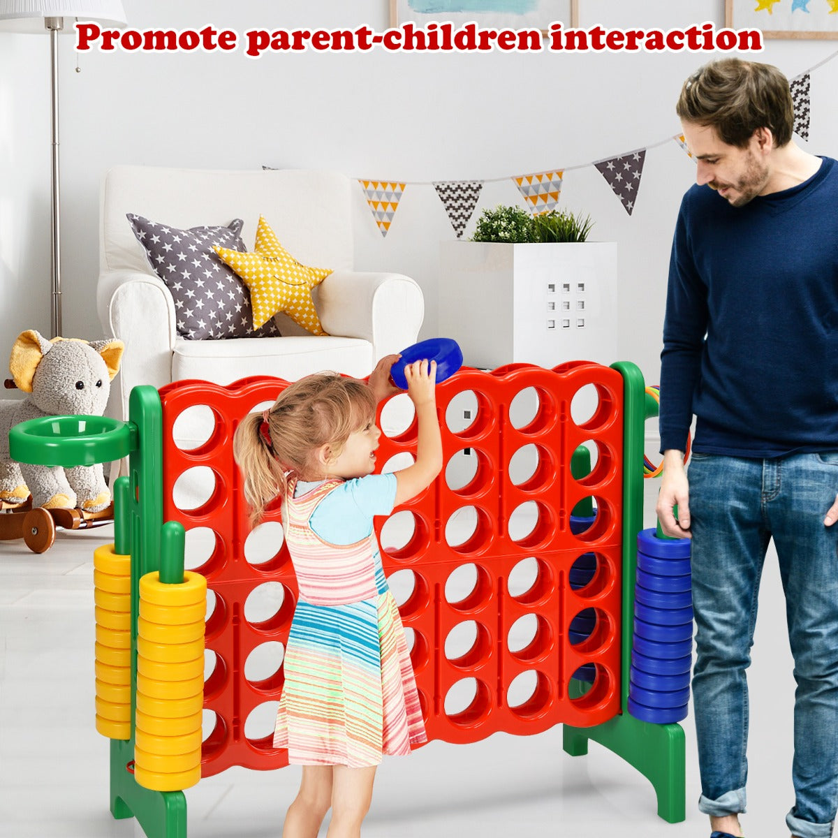 Have a blast with your family with this giant 4-in-a row game set. Designed with 3-in1 function, it keeps everyone entertained for hours, perfect for both adults and kids. Made of premium PP and PE material, it features a long lifespan and better toughness. For kids, high-quality material is safe and nontoxic for long-time use. Plus, it assists children in ability development. By aligning four pieces in a row and blocking opponent’s pieces, children effectively enhance cognitive ability, hand-eye cooperation, logical thinking and more. Additionally, it’s of great ease to assemble the set within minutes without any tool. With the weight of 4.5 kg, it’s convenient to carry out for outdoor use. Surely, it fits in exactly with your wishes. Bullet Point: Fun for Everyone Everywhere: Just have a blast with this 4-in-a row game set at home, birthday or holiday parties, weddings, friend gatherings and more. It’s perfect for users of all ages as well as indoor and outdoor use. Thanks to that, family game nights can be more exciting and enjoyable. 3-in-1 Design for Endless Fun: A smart combination of 4-to-score game, shooting game and ring game definitely offers more fun. Three different games serve to keep everyone entertained for long hours. With only one game set, everyone can be immersed in their favorite games and enjoy a completely different playing experience. Kids-friendly Material and Durable Construction: The safe and durable material leaves you no worry about using ability. The game set is constructed of premium PP and PE material. Not only can this game set last for years, but it is also friendly to kids and nontoxic to use. Develop in Fun: Though proving endless fun, the 4-to-score giant game set is also beneficial to ability development. Kids' motor skills, hand-eye coordination, logical thinking are effectively promoted during games and cooperation. Besides, the colorful design is conductive to cognitive ability development. Easy Assembly and Lightweight Structure: To be more friendly in use, the game set can be quickly assembled within minutes without any tool. Besides, you can easily reset the game by pulling out the slider on the bottom. And the whole set only weighs 4.5kg, lightweight to carry out for outdoor use. Features: Quick assemble or disassemble in a few minutes Lightweight enough to carry out for outdoor use Wide application for home, beach, party, school use Constructed of premium PP and PE material to last for years Have critical thinking, counting, observation abilities enhanced Two quick-release slides make it convenient to reset the game Perfect for both adults and kids, as well as indoor and outdoor play Oversized version of classic 4-in-a-row game for a special using experience 3-in-1 design of 4-in-a-row game, shooting game and ring game for more fun Specifications: Color: As Shows in Picture Material: PP + PE Product Dimensions: 85 x 33 x 74 cm (L x W x H) Net Weight: 4.5kg Note:Cheese Pieces Size: 9cm x 2.5cm (Dia. x Thickness) Basketball Hoop Diameter: 17.5cm Basketball Diameter: 9.5cm Package includes: 1 x 4-In-a-row Game 21 × Blue Rings 21 × Yellow Rings 5 × Toss Rings 1 × Basketball 1 x Instruction Box Qty:1(May vary by batch)