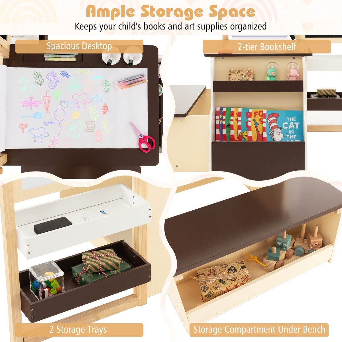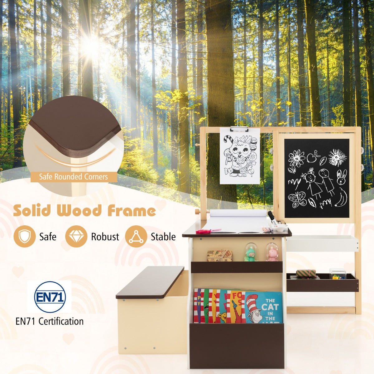 NNECW Kids Art Table & Bench Set with Double-Sided Adjustable Easel-Coffee