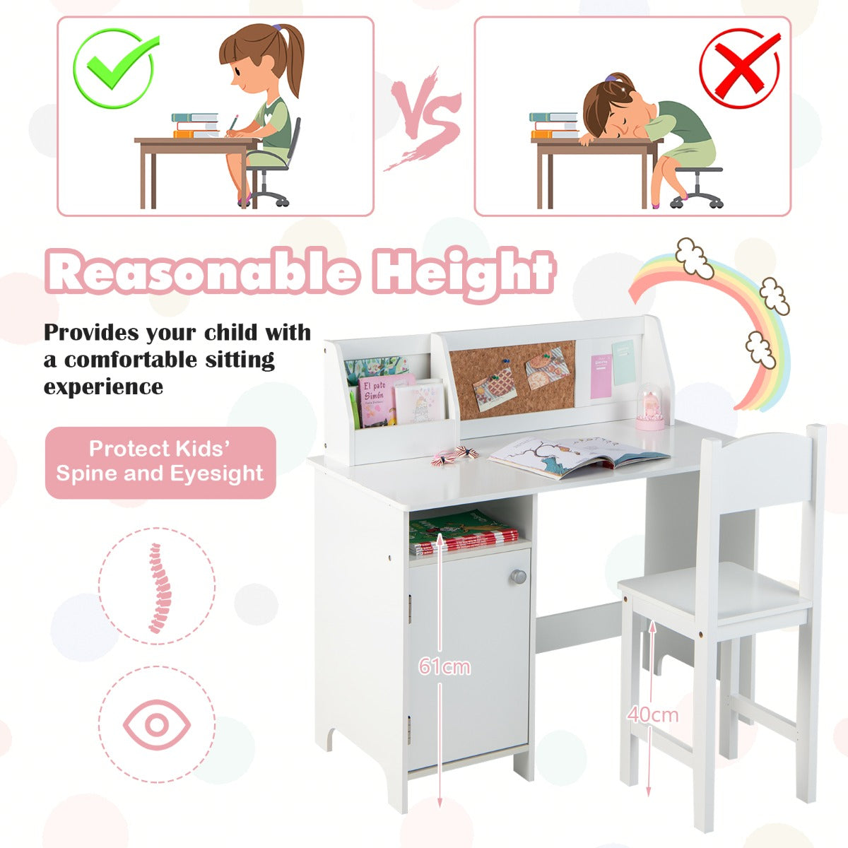 Ergonomic Chair & Scientific Heights: With a cozy backrest, the chair lets your child sit comfortably. What's more, the distance from ground to tabletop is 61 cm and the seat height is 40 cm. This is a scientific design for students and protects their spine and eyesight.
