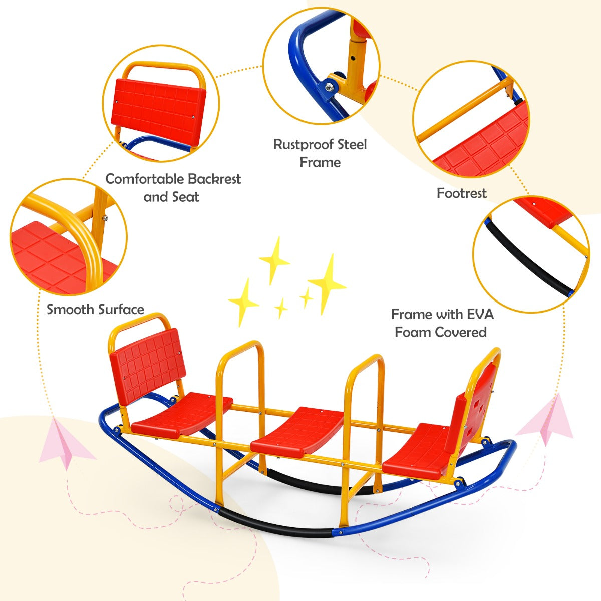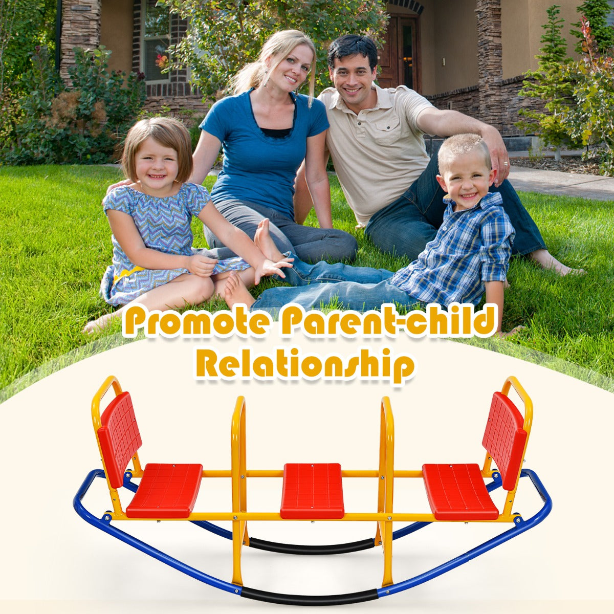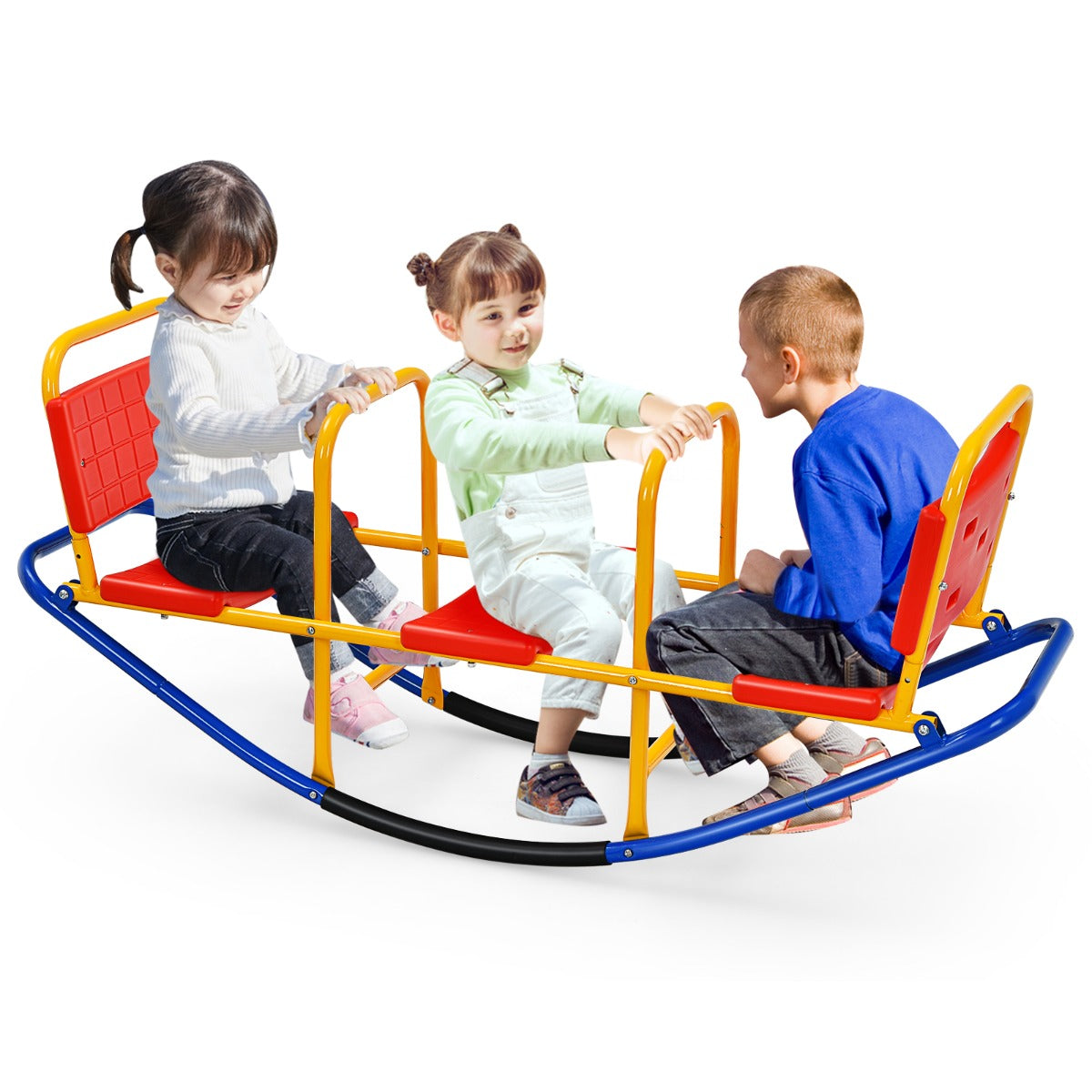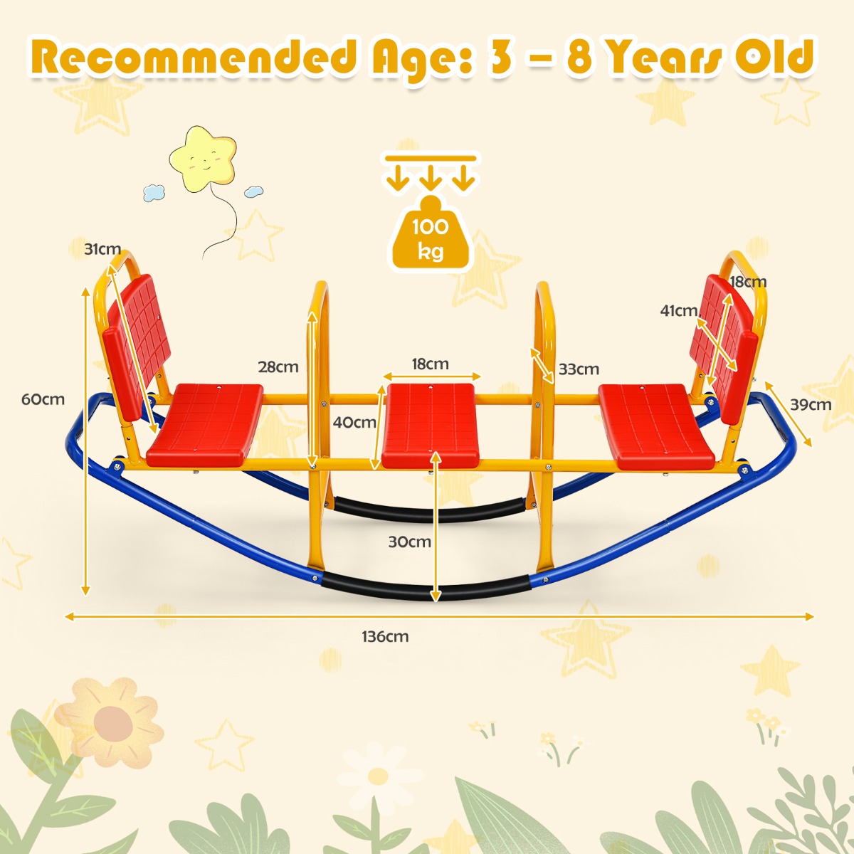 3-Seat Seesaw: Different from common seesaws, this premium metal teeter totter features 3 seats, which is suitable for 3 children to rock at one time. Therefore, this rocking chair promotes teamwork, develops social skills and improves balance while playing.