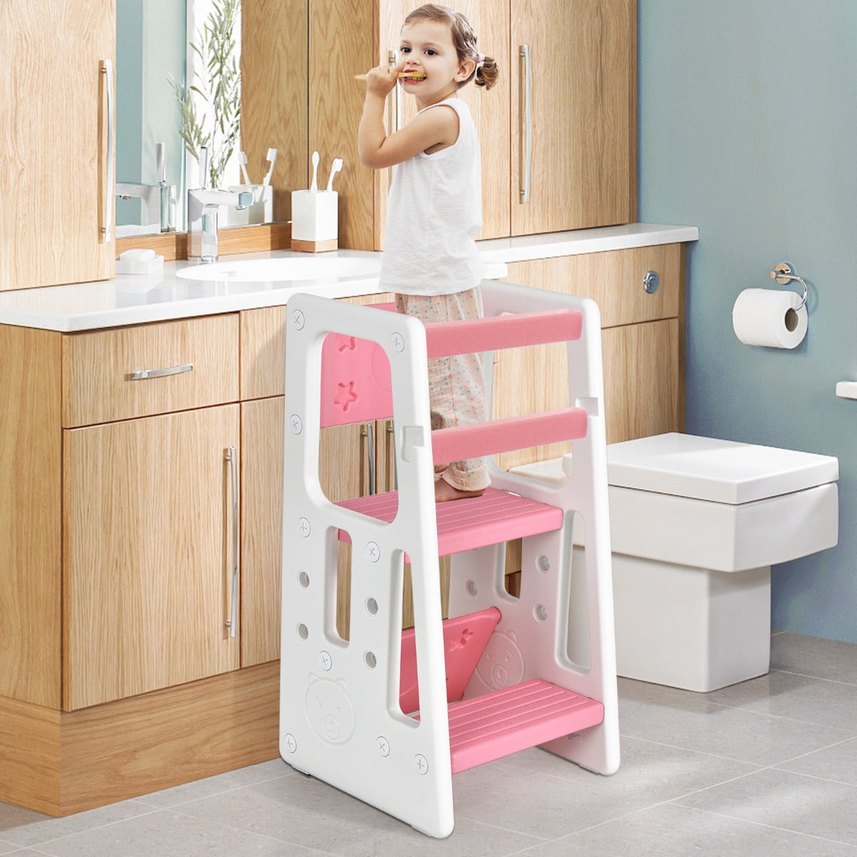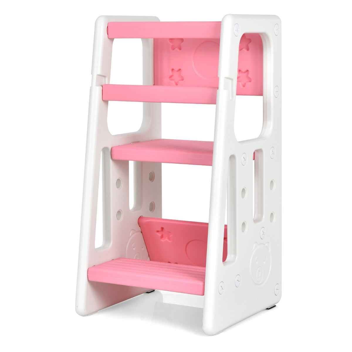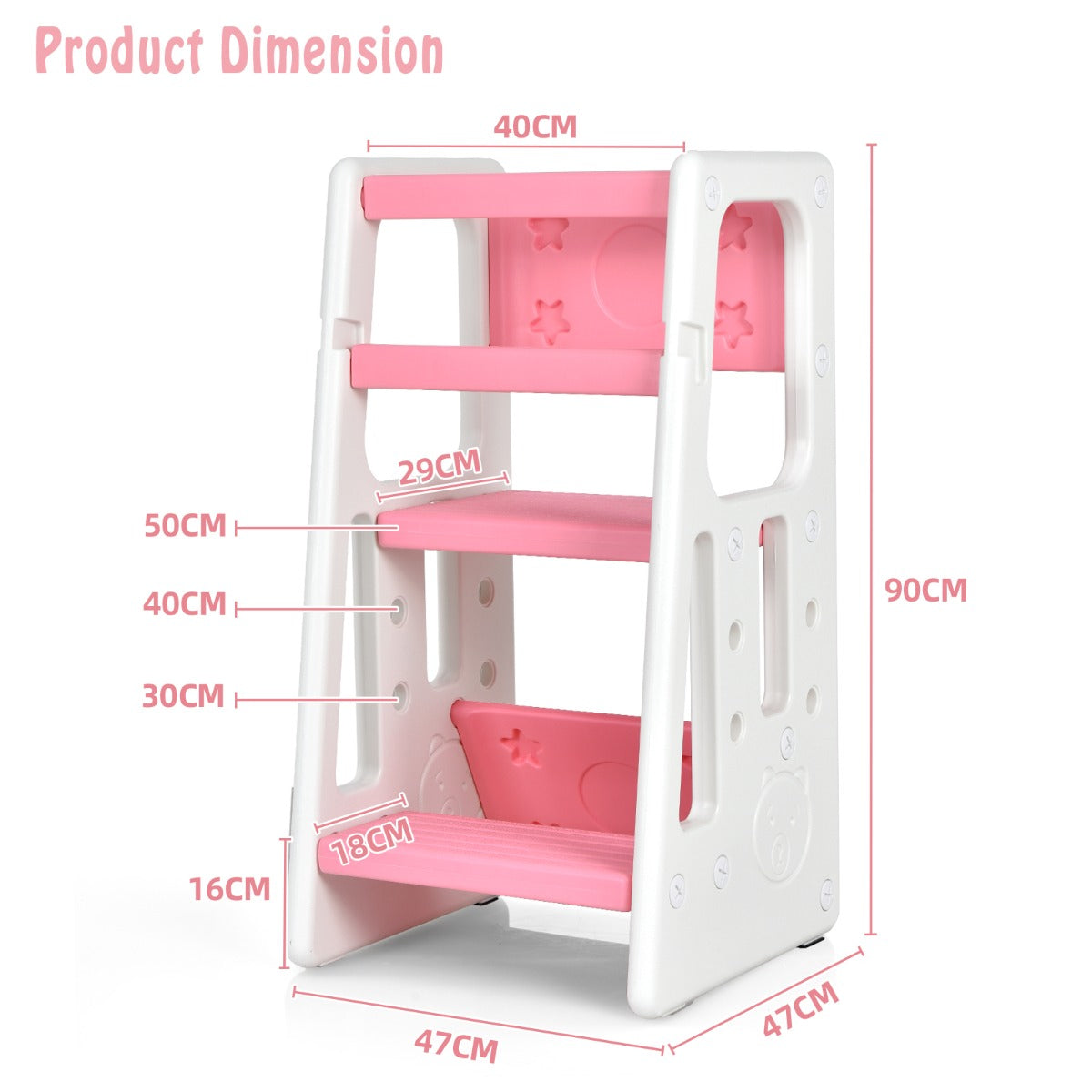 Enjoy every moment of family togetherness with this kid's kitchen step stool! With 3 adjustable heights, this toddler tower not only grows with your kids but also allows your children to experience how to cook, wash their hands, brush their teeth and do other daily activities with you. Therefore, this toddler stepping stool cultivates kids’ hands-on abilities while promoting the parent-child relationship. What’s more, the double safety rails, smooth surface, anti-slip steps and EVA foot pads make these kids learning stools safe for your kids to climb up and stand on. If your children grow so tall that they don’t need this kid-standing tower’s help anymore, just remove the double safety rails to make it used as a kid's chair for companionship in the future.