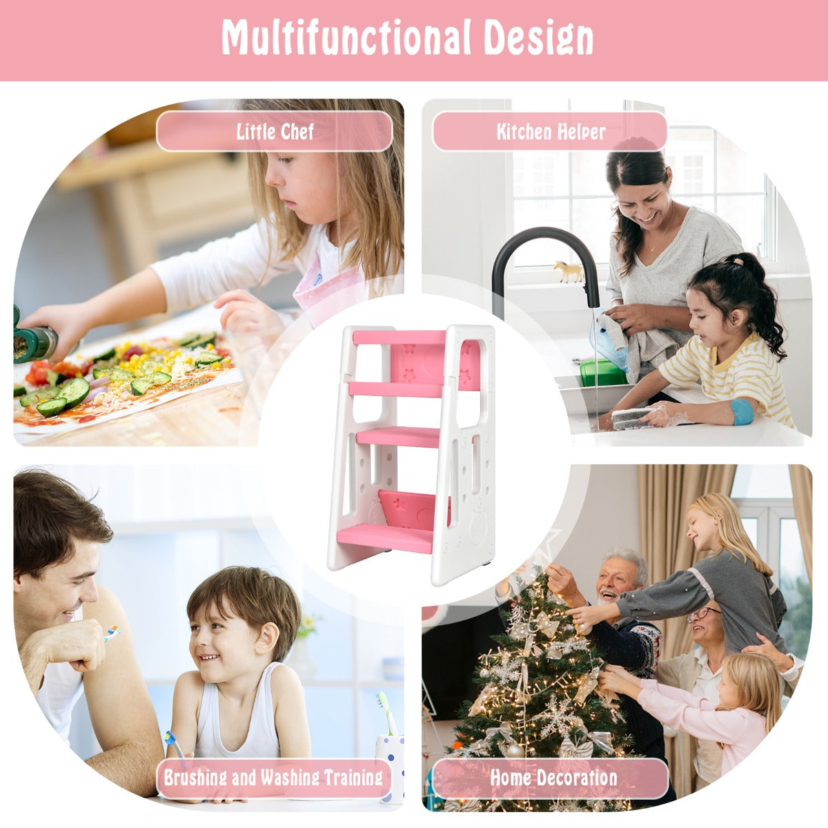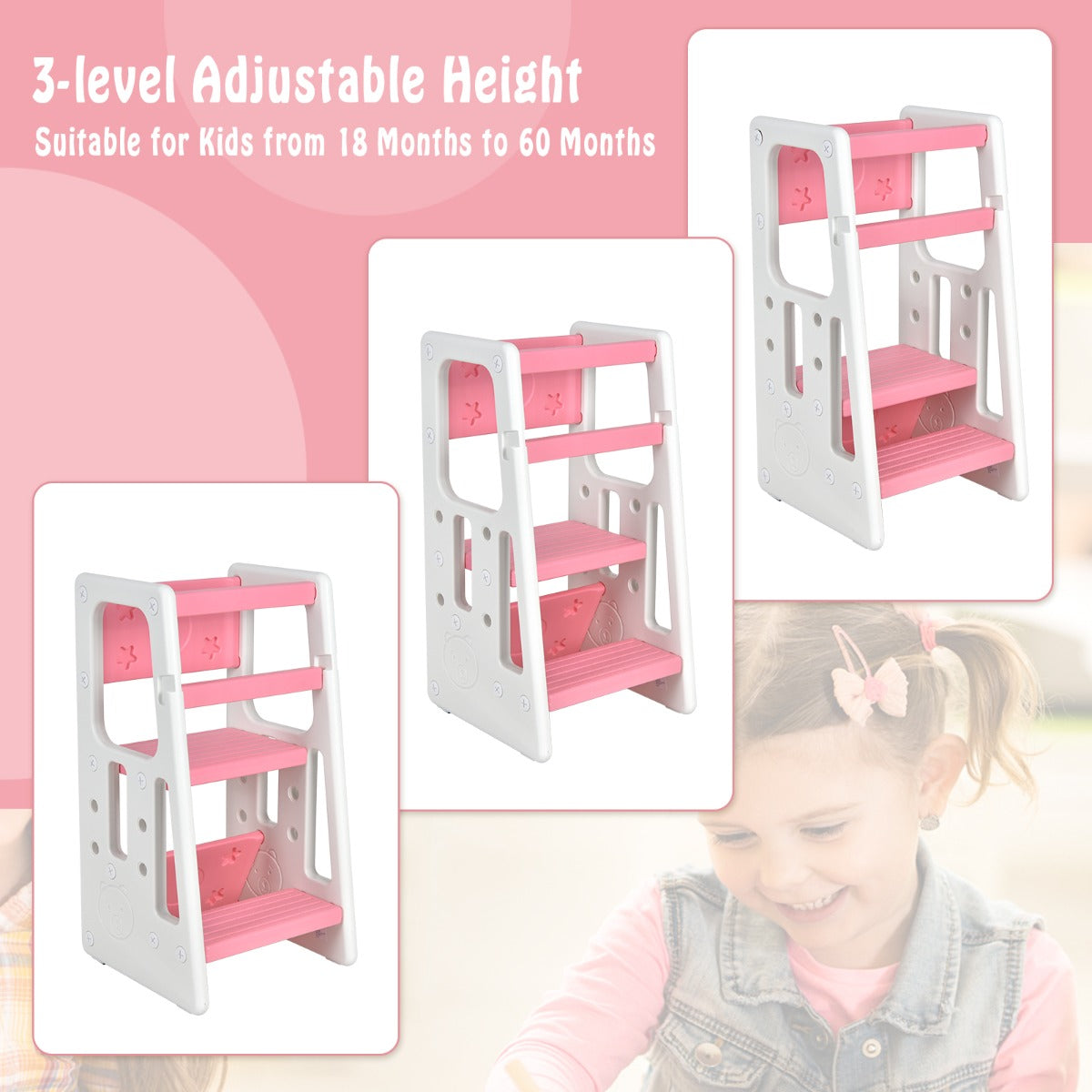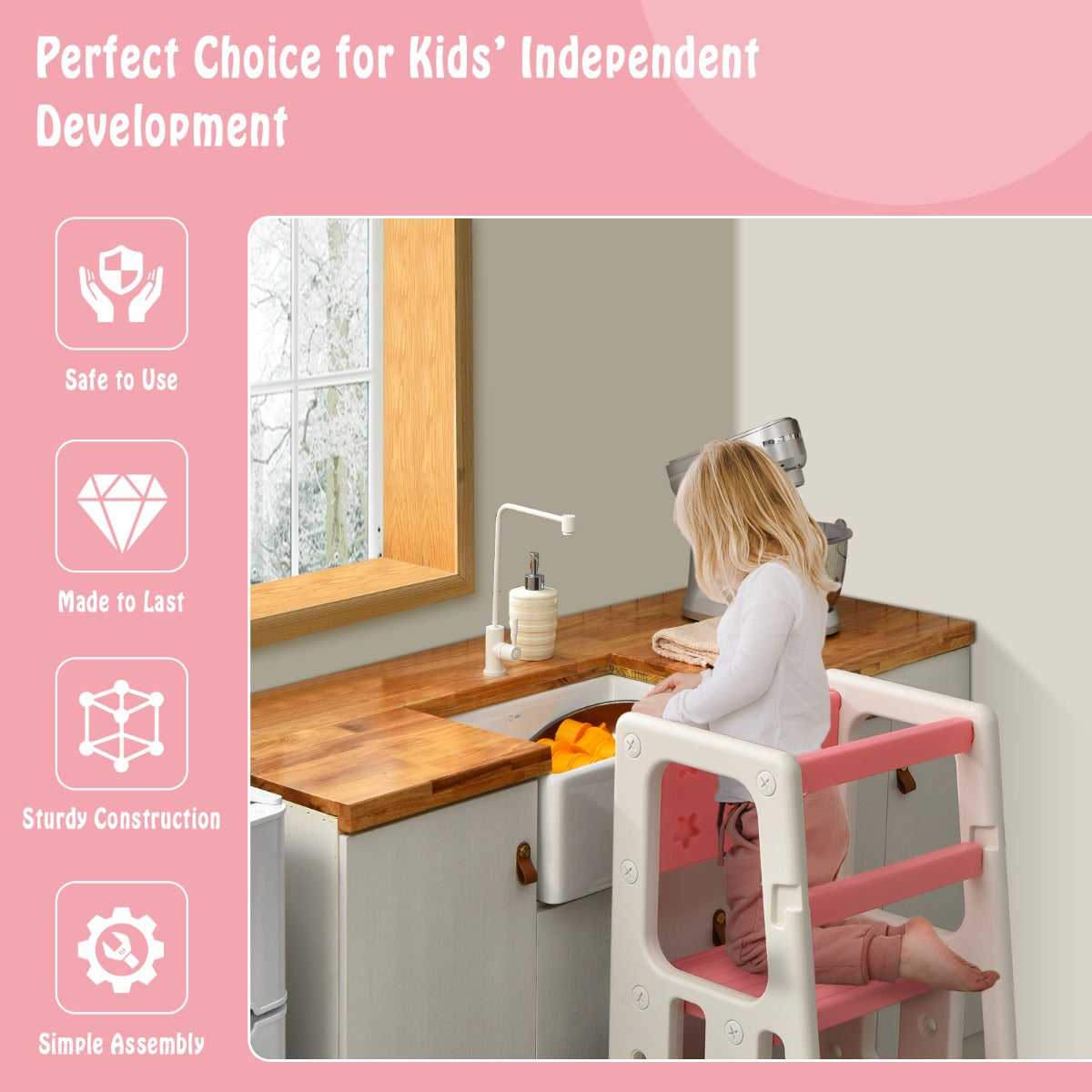 Enjoy every moment of family togetherness with this kid's kitchen step stool! With 3 adjustable heights, this toddler tower not only grows with your kids but also allows your children to experience how to cook, wash their hands, brush their teeth and do other daily activities with you. Therefore, this toddler stepping stool cultivates kids’ hands-on abilities while promoting the parent-child relationship. What’s more, the double safety rails, smooth surface, anti-slip steps and EVA foot pads make these kids learning stools safe for your kids to climb up and stand on. If your children grow so tall that they don’t need this kid-standing tower’s help anymore, just remove the double safety rails to make it used as a kid's chair for companionship in the future.