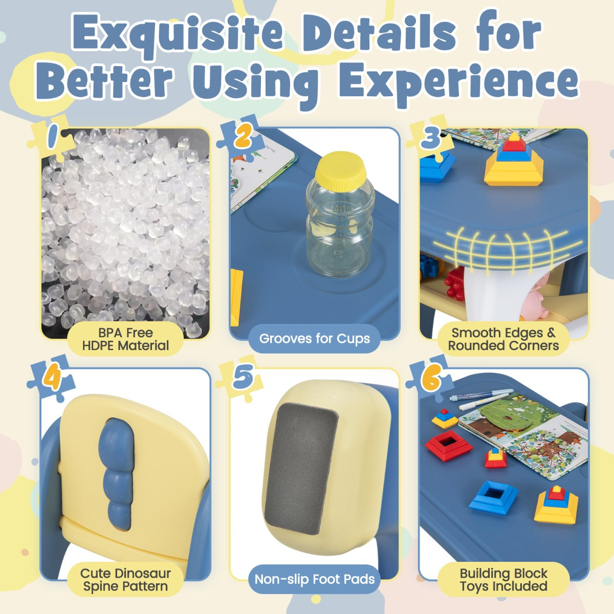 Unleash toddler's creativity and imagination with the kids table and 2 chairs set! The children's table set comprises a table and 2 chairs, offering a place for kids' activities. Made of premium HDPE material that is BPA free, the activity table with 2 chairs is durable and safe for toddlers. And the ergonomic backrest and seat make children comfortable while sitting. The shelf under the tabletop is designed with concaves, avoids hitting toddlers' knees. At the same time, all the table and 2 chairs are polished smooth and round to protect kids' delicate skin. With the 3-piece kiddy table and chairs set, kids are able to do various things, such as playing, drawing, eating and more. Bullet Point: Selected Material & Safe Design: The kids table and chairs set is made of high quality HDPE material for long-lasting use. Meanwhile, the BPA free material protects kids' safety and health. The round corners and burr free surface also prevent kids' delicate skin from scratches. Comfortable & Proper Sitting: Designed with ergonomic backrest and seat, the chairs allow kids to sit comfortably and help them develop a proper sitting habit. What's more, the shelf under the tabletop with curved design avoids hitting children's knees during use. Multi-purpose Kids Table Set: The activity table with 2 chairs creates a place for your toddlers to do a variety of activities. It is suitable for kids to do arts and crafts, do homework, draw, eat snacks and encourages their other interests. Ideal Size & Perfect Gift for Kids: The toddler table and chairs set features an appropriate size for kids. And the lightweight design makes it easy to move. Thus, this 3-piece kiddy table and chairs set is a perfect gift for boys and girls over 3 years old. Easy to Assemble & Maintain: Equipped with a clear instruction, the toddler's 3-piece table and chairs set is easy to put together. When the surface gets stained, all you need to do is to wipe it with a clean rag. Features: BPA free HDPE material for durability and safety Thoughtful backrest and seat for a cozy sitting Rounded corners and edges for kids' security The concave shelf under the desktop for comfort Suitable for learning, playing, drawing, dining and more Lightweight design for effortless movement Vivid color matching for kids over 3 years old Easy to assemble with illustrated user's manual Water resistant surface for simple cleaning Specifications: Color: Blue Material: HDPE Dimension of Table: 79 x 49 x 49 cm (L x W x H) Dimension of Each Chair: 42 x 38 x 52 cm (L x W x H) Size of Backrest: 29 x 26 cm (W x H) Size of Seat: 29 x 28 cm (L x W) Seat Height: 26 cm Net Weight: 8 kg Weight Capacity of Table: 25 kg Weight Capacity of Each Chair: 25 kg Package Includes: 1 x Kids Table 2 x Chairs 1 x Instruction Box Qty:1(May vary by batch)