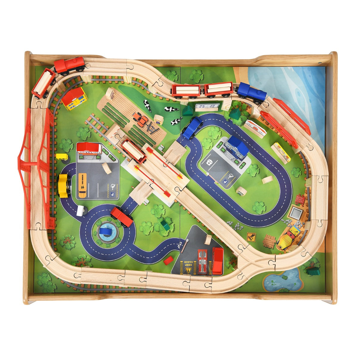 NNECW Kids Wooden Train Track Railway Set Table with 100 Multicolor Pieces