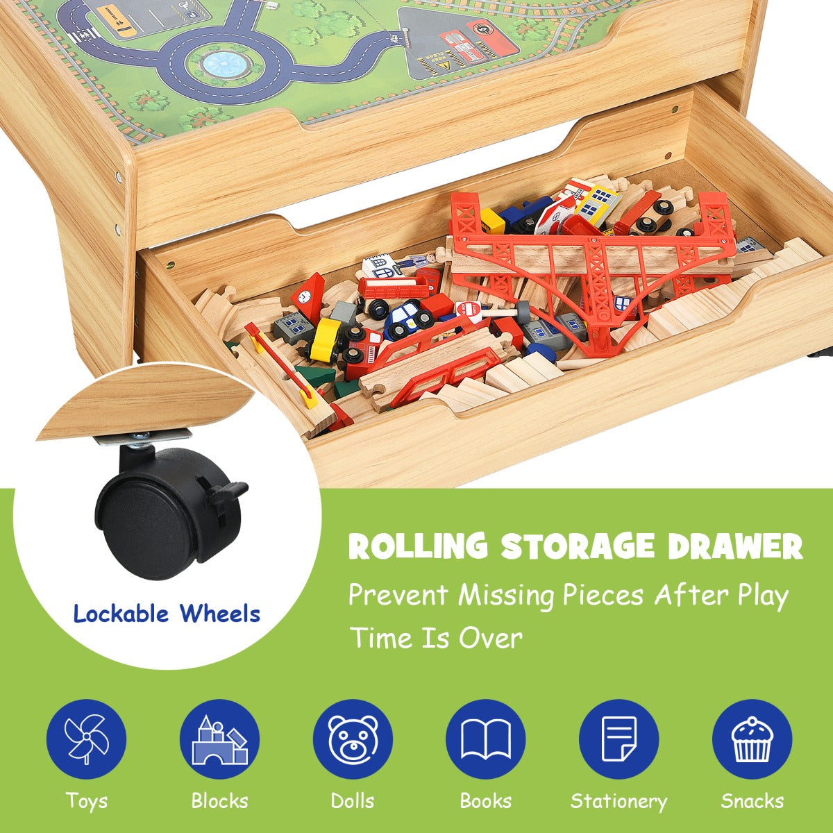 This wooden train track set table will be a great gift for your kids. With 100 multicolour and vibrant accessories, kids can explore the fun of building and sharing it with friends. And the height of the table is suitable for kids to stand or kneel to play. High stability and durability will make the table set accompany kids for years to come. The rolling storage drawer under the table provides space for kids to put daily items and train track accessories. What’s more, we care much about kids’ health and safety, so all the materials are non-toxic and odourless. Our product is quite suitable for children over 3 years old. If you are looking for a premium gift for your kid’s birthday or other special days, our train track set table will be a fabulous choice. Bullet Point: 100 Multicolor Toy Pieces: This train track set includes 100-piece accessories featuring railways, vivid characters, appealing houses, signs, vehicles and bridges, enabling kids to start adventurous excursions with creativity. Also, this training set will effectively improve kids’ concentration and hand-eye coordination. It is a great gift for kids. Durable & Healthy Material: Considering kids’ delicate skin, we have selected child-friendly and natural beech wood as the material for train tracks. And our train set table with all accessories is ASTM and CPSIA-certificated, non-toxic and odourless. Additionally, our product possesses high durability, ensuring a long service time. Useful Rolling Storage Drawer: After playtime is over, all the pieces can be stored in the storage drawer under the table and thus there will be no missing parts. What’s more, the drawer is equipped with four rolling wheels, two of which are lockable, so it can be moved and stopped easily and keep daily items always at hand. Exquisite & Humanized Details: Four stable wooden legs offer strong support to all the pieces on the tabletop and prevent the table from wobbling. And the round corner protects kids from scratches. Moreover, the surfaces of the table and drawer are smooth and waterproof, so daily maintenance will be much easier. Easy Assembly & DIY Design: With easy-to-follow instructions, kids can finish the assembly with the help of their parents. And there are no limits to building ways, kids can connect the tracks and put every graphic with their imagination. The train set can also be placed on the floor for more building space. Features: 100 vivid and colourful toy pieces satisfy kids' imagination Including railways, vivid characters, appealing houses, signs, vehicles and bridges Natural beech wood without odour and harm is good for kids' health High quality with ASTM and CPSIA certification Storage drawer prevents missing pieces after playing Lockable wheels for easy movement of the storage drawer Sturdy wooden legs offer strong support and make the table standstill Round corner ensures kids' safety and avoids scratches A smooth surface makes daily maintenance more convenient Clear instruction and complete hardware for easy assembly Do it yourself without any limits of building ways It will improve kids' concentration and hand-eye coordination The train set can be placed on the floor for more building space Specifications: Colour: Natural Material: MDF + PVC + Beech Wood + PP Table Dimension: 78 x 63 x 33 cm (L x W x H) Drawer Dimension: 70 x 36 x 19 cm (L x W x H) Net Weight: 13kg Suitable Age: 3+ Years Old Package Includes: 1 x Table 1 x Rolling Drawer 100 x Toy Pieces 1 x Instruction Box Qty:1(May vary by batch)