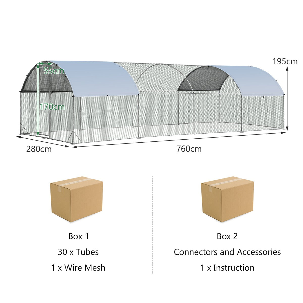 Easy Installation & Large Space: All parts and components are tightly wrapped. The illustrated manual and necessary hardware makes assembly effortless. The overall dimension is 190 x 280 x 195 cm (L x W x H)/380 x 280 x 195 cm (L x W x H)/570 x 280 x 195 cm (L x W x H)/760 x 280 x 195 cm (L x W x H)which is spacious enough for small and middle sized animals to walk, run, play and rest.You can also put wood coop in to have a more safe and comfortable environment to your chicken.