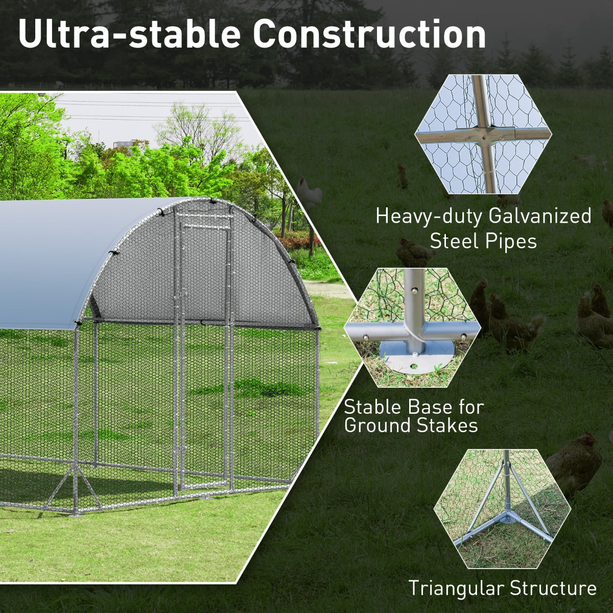 Excellent Stability and Durability: Constructed of heavy-duty metal frame with galvanized treatment, our chicken coop is extremely sturdy, rust-resistant and durable, capable of standing long-term outdoor use. What’s more, the stable triangular structure, coupled with ground stakes, greatly enhances stability.