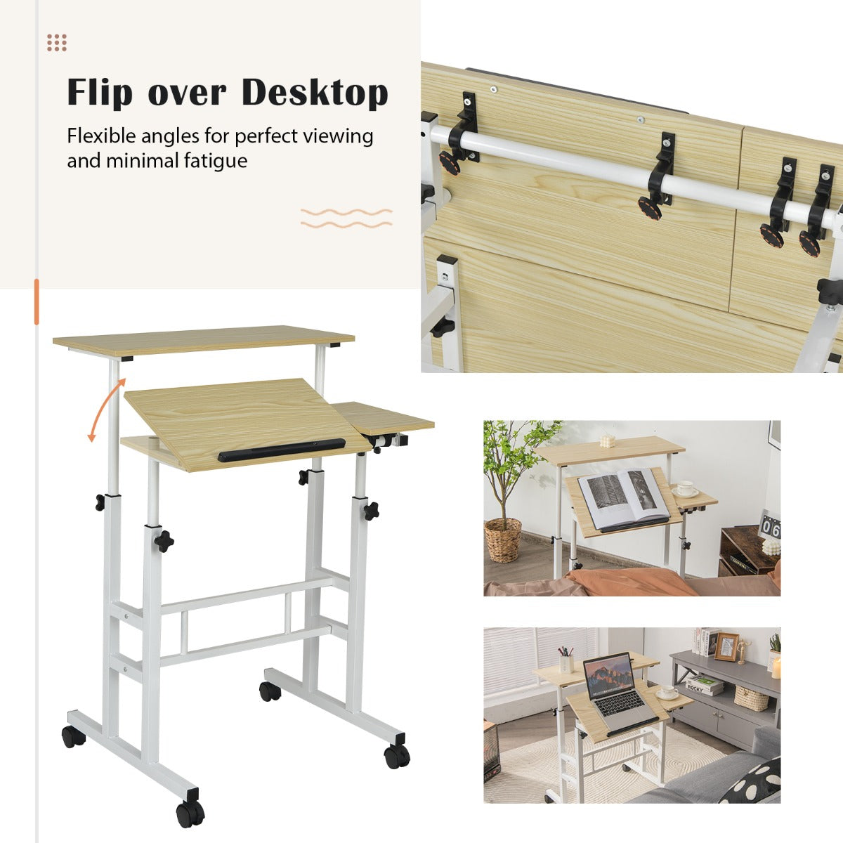 NNECW Mobile Stand up Computer Desk with 2 Tilting Desktops for Office-Natural
