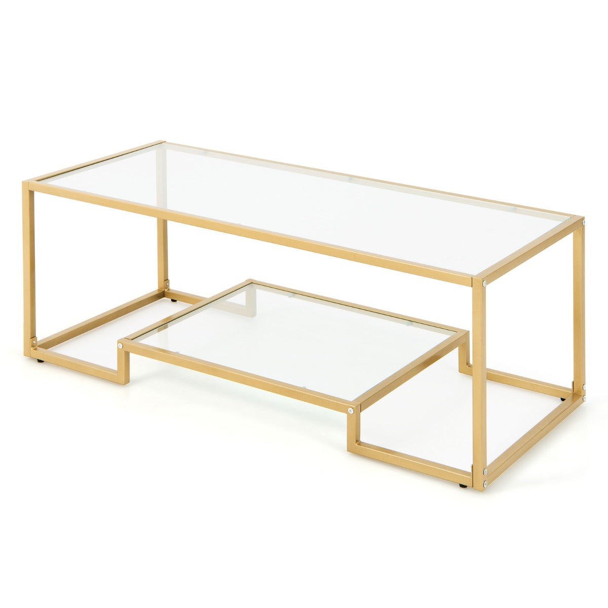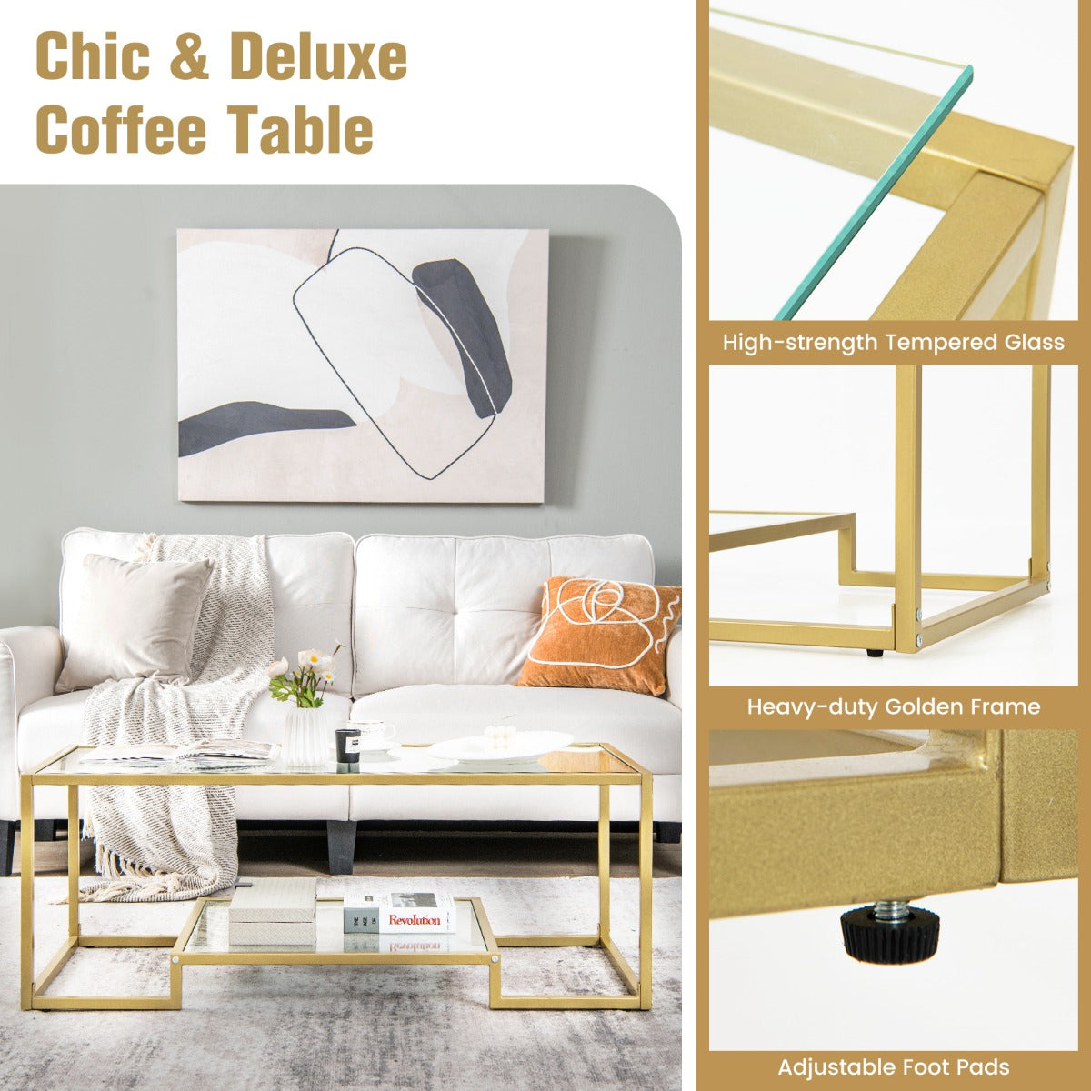 Chic & Deluxe Coffee Table: Featuring high-glossy glass tabletop and golden metal frame, the eye-catching 2-tier coffee table will be the highlight of the contemporary living room or office decor. What's more, the double transparent glass layers also breathe a modern and airy flair into the room.