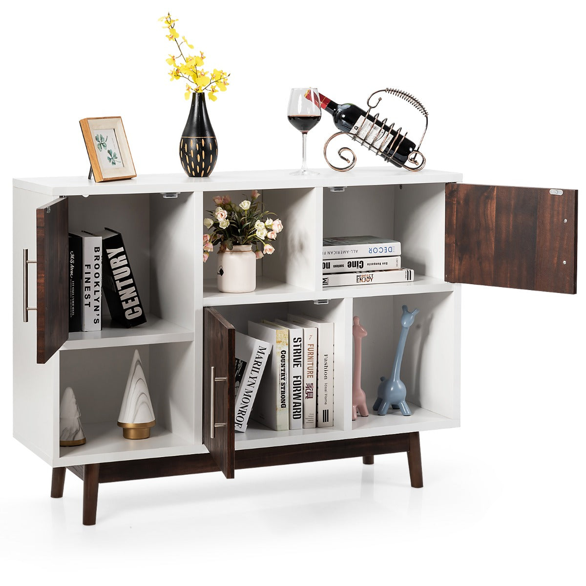 A fresh way to organize your home, this pine-wood legged buffet table, made out of high-grade particle wood, is durable and stable. 6 compartments with varying sizes for displaying and hidden storage offer you a well-organized cabinet and feature an irregular flavour in the meantime. Combined with espresso-grained doors, this side table expresses a sense of modernity and trend. Double laminations contribute to a smooth surface. It is easy to maintain and install.