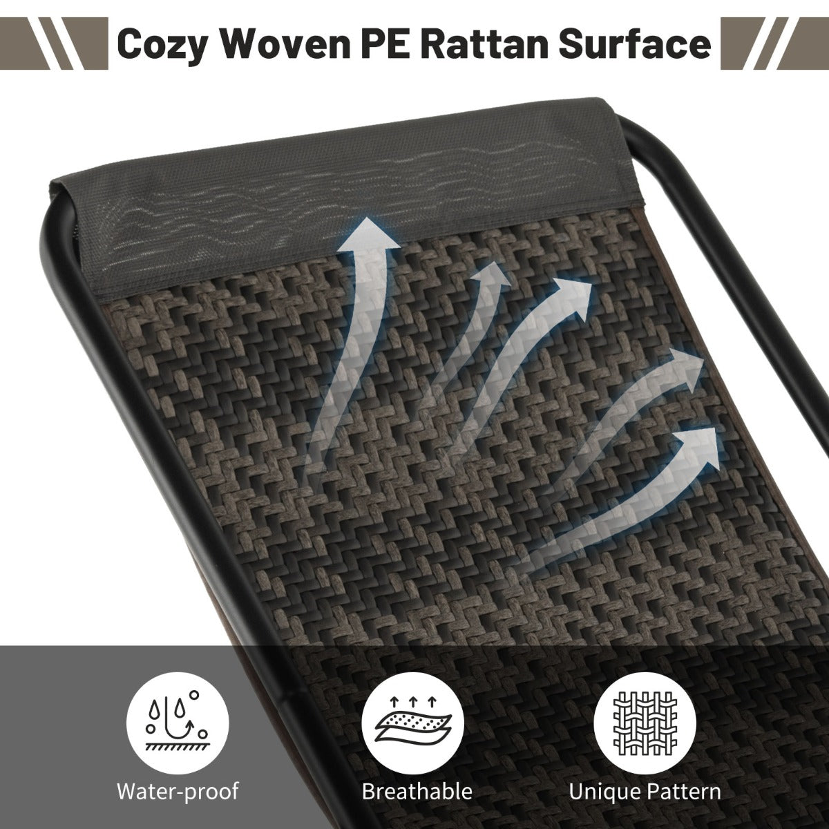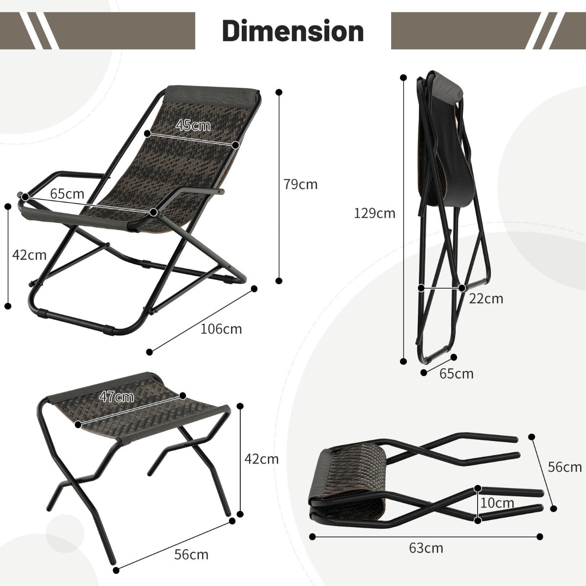 Make your leisure time more peaceful and comfortable with our outdoor folding sling chair! Different from others, our beach chair is ergonomically designed with gentle rocking motion, allowing you to rock back and forth smoothly and quietly. While rocking, your arms can be put on the curved armrests. Moreover, the natural curve fits your body perfectly for maximum comfort. Hey, don't worry about the quality. We especially use the colorfast PE wicker and rustproof metal frame as the materials for outdoors. If you need to go back indoors, just fold this beach chair for easy storage. Bullet Point: Selected PE Wicker: The lying area is made of selected mix gray PE wicker that is colorfast, sun-protective, breathable and durable to ensure a longer outdoor lifespan while avoiding stuffiness for comfort. Sturdy Metal Frame: Supported by heavy-duty metal frame with reinforced X-shaped structure, this patio sling chair comes with 160 kg max load for strong support. And the anti-slip foot pads enhance stability. Smooth Rocking Motion: This outdoor sling chair can rock back and forth for full relaxation. Likewise, the ergonomic natural curve and metal armrests take comfort to a new level. Folding Sling Chair: The folding design endows this outdoor rocking chair with the advantages of easy storage for space-saving and easy movement for great convenience. Product Dimension: Unfolding dimension: 106 x 65 x 79 cm (L x W x H), folding dimension: 129 x 65 x 22 cm (L x W x H). This outdoor folding sling chair is suitable for the beach, porch, patio and backyard, etc. Features: Colorfast and sun-protective mix gray PE wicker for outdoor durability Hold up to 160 kg max load thanks to the sturdy and anti-rust metal frame Reinforced X-shaped structure and non-slip foot pads for extra stability Rock back and forth for full relaxation and enjoyment Make you feel cozier with the ergonomic natural curve and metal armrests Foldable and portable design for easy storage and movement Suitable for porch, patio, poolside, backyard and beach, etc Simple assembly required Specifications: Color of PE Rattan: Mix Gray Material: PE Rattan, Metal Unfolding Dimension of Chair: 106 x 65 x 79 cm (L x W x H) Unfolding Dimension of Footrest: 56 x 47 x 42 cm (L x W x H) Seat Height from the Ground: 42 cm Folding Dimension of Chair:129 x 65 x 22 cm (L x W x H) Net Weight of Chair: 6 kg Weight Capacity of Chair: 160 kg Weight Capacity of Footrest: 50 kg Package Includes: 1 x Chair/1 x Chair with Footrest 1 x Instruction Box Qty:1(May vary by batch)