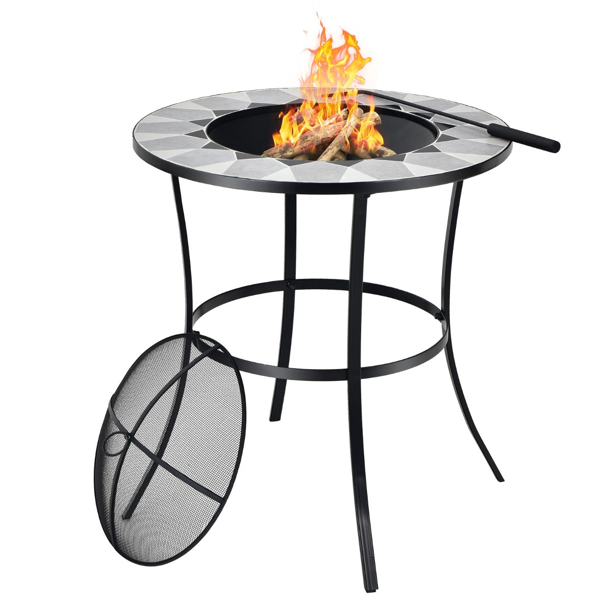 This round wood-burning fire pit with a stylish appearance and simple style will add warmth and ambience to your patio, deck, backyard and so on. Made of sturdy steel with a powder-coated finish, this fire pit features great durability and sturdiness. Additionally, the fire pit table features a round tabletop around the centre fire area, providing a perfect place for placing drinks and roasting supplies. It comes complete with an easy-to-lift mesh cover and a fire poker, which improves safety while using. This fire pit will be a perfect addition to your outdoor space while keeping you warm when it gets colder in the evening.