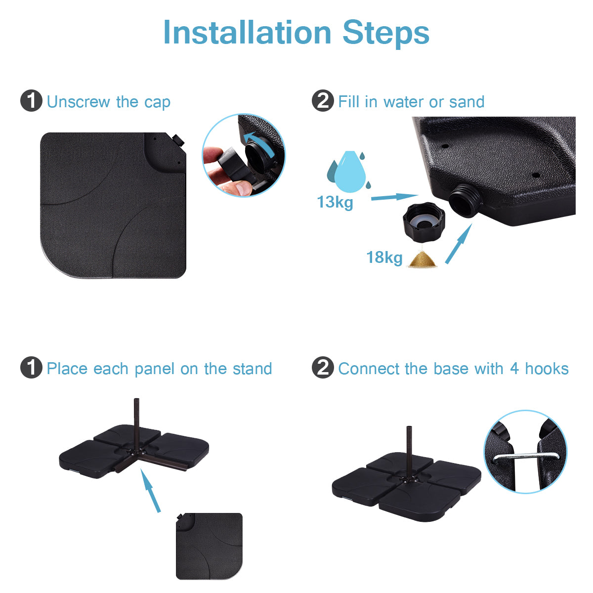 This brand-new water-filled umbrella base is a durable base for your patio umbrella. It’s constructed of heavy-duty HDPE plastic with weather-resistant UV protection that prevents colour from fading and is easy to maintain. It can be filled with 72kg sand /52kg water so that plates provide additional weight to make your patio umbrella stand perfectly in windy conditions, You don’t need to worry about any puff of wind which disturbs your summer relaxation in the shade. Don't hesitate to buy one!