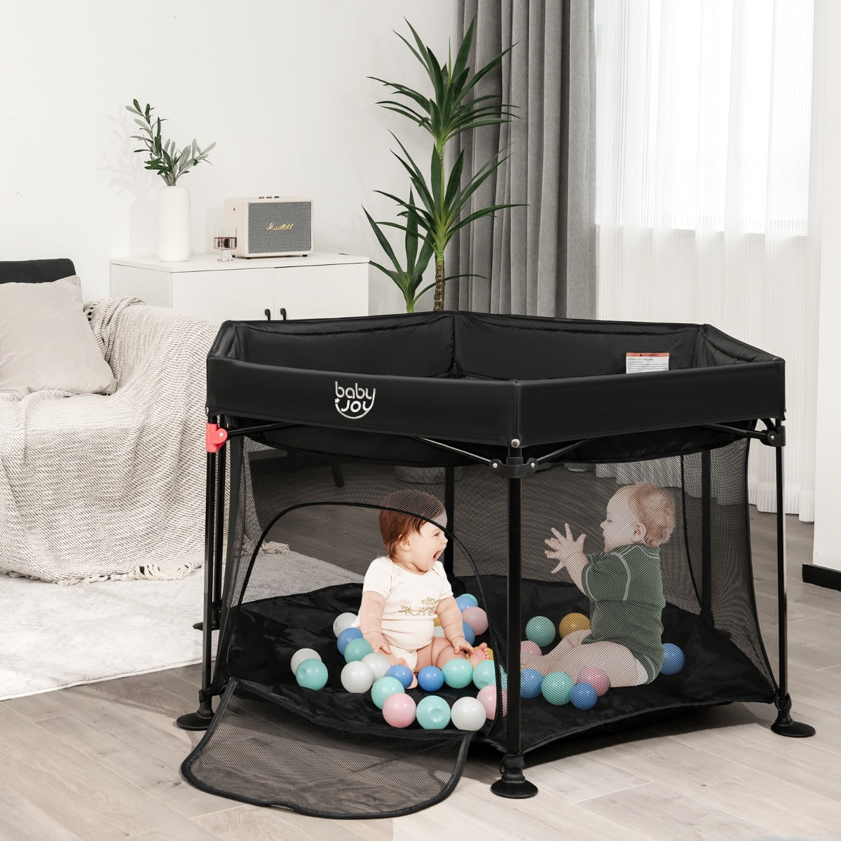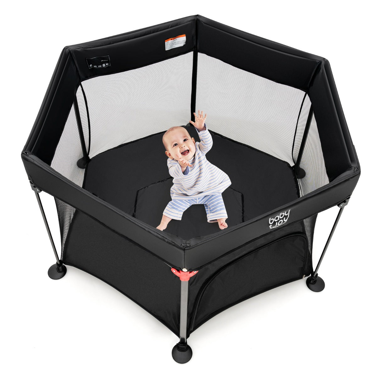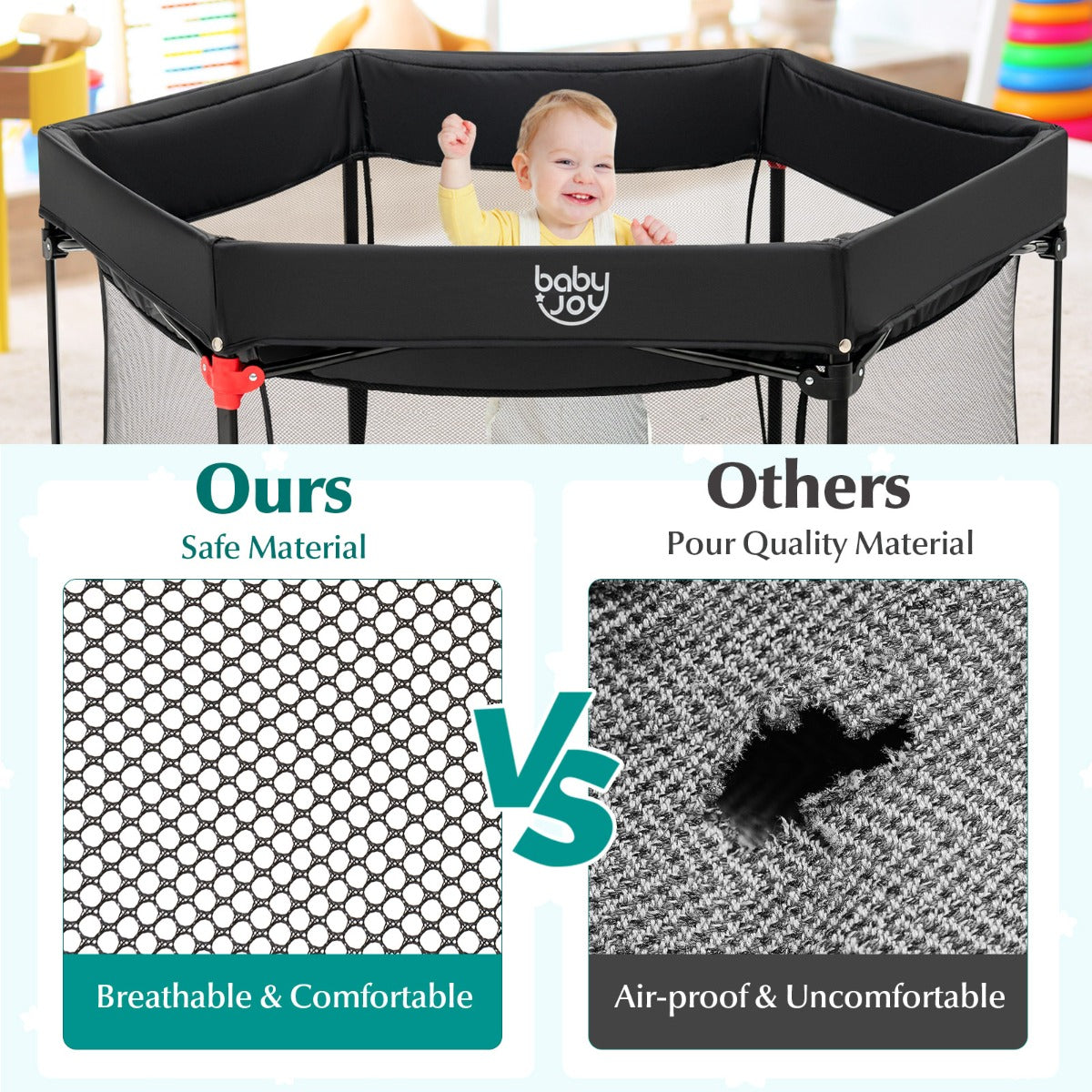 Safe and Stable Structure: Supported by a sturdy rust-resistant steel frame in a stable hexagonal structure, this play yard features 360° all-round surrounding mesh wall, providing parents with a good view to keep an eye on the conditions of their children at any time. In addition, 6 non-slip foot pads provide better stability and protect the floor from scratches.