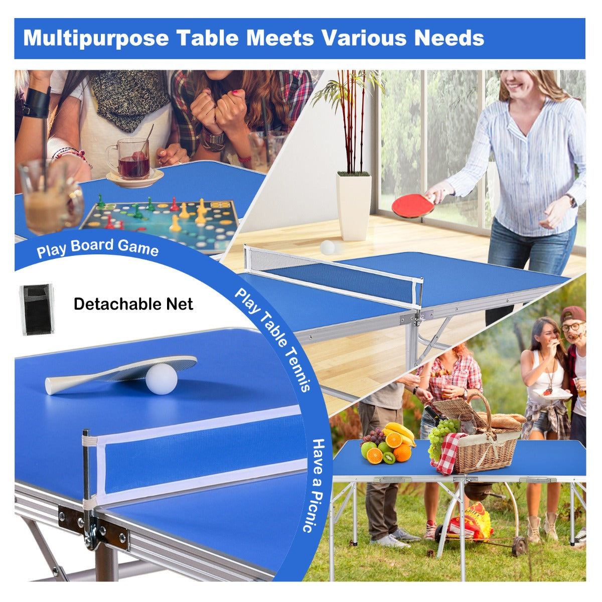 Multifunctional Ping Pong Table: It is Ideal for games rooms, apartments, offices, or anyone who doesn't want to deal with full-size tables. And the detachable net turns the game table into a perfect outdoor dining table as well. Furthermore, the aluminum structure and protective round corners also protect your children from accidental bumping.