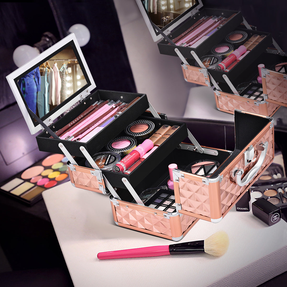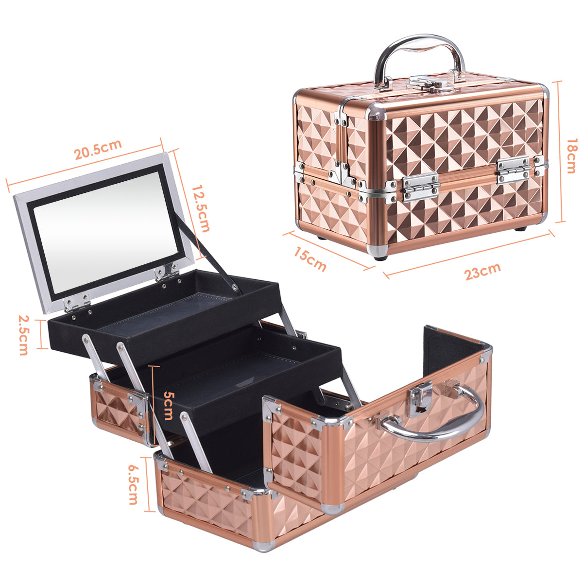 Portable Mini Makeup Train Case: This mini makeup train case is made of durable ABS plastic, aluminum corners and lockable latches.