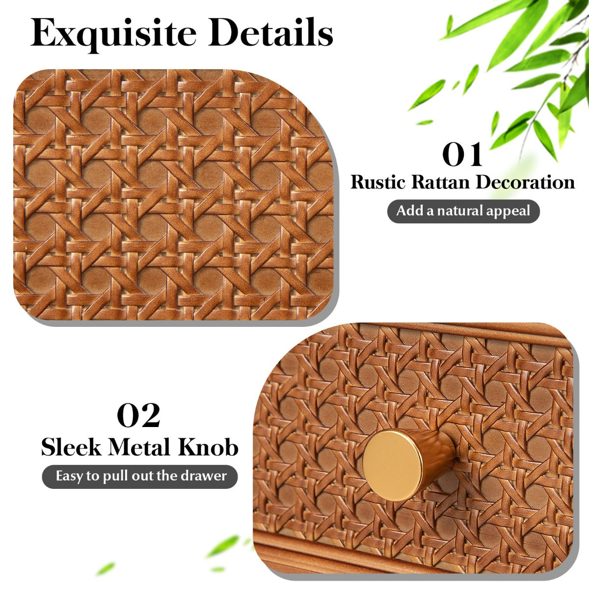 Need a beautiful nightstand to elevate your bedroom? This boho rattan bedside table is a good choice! With rustic rattan decoration and exquisite golden knob, the accent table is a charming piece that echos the furnishing style of your room. Besides, it is also a handy storage organizer by the sofa or bed to hold your eyeglasses, phones, magazines, cups, etc. And the pull-out drawer provides you with a private space for important items or just some odds and ends. Its splayed tapered legs are inspired by mid-century modern furniture, which also adds to the overall appeal. What's more, the solid wood legs with a firm connection and reinforced crossbar form a sturdy construction to support the load. Bullet Point: Exquisite Details: The boho-style nightstand features rattan accents and golden knob, a unique combination to create a vacation-like vibe. Besides, the tapered legs grant a mid-century modern flair to make the accent table even more attractive. Solid Wood Legs for Excellent Stability: The table legs are made of solid wood, which boasts excellent durability and large weight capacity. Moreover, the reinforced crossbar and non-slip foot pads also help to enhance the overall stability of the sofa side table. Handy Storage Space for Convenience: The 38 x 38cm tabletop of the bedside table offers you a pleasant and convenient place for displaying your beloved ornaments, stashing your jammies, or other bedtime essentials alike. Everything you need is close at hand.! Bonus Space for Privacy: If you need more private storage space, then this end table's drawer is perfect. The spacious drawer satisfies your needs of storing bedtime lotions, treasured photo albums, trinkets, etc., leaving you with a tidy and clean tabletop. User-friendly Features: The waterproof smooth finish allows you to wipe off dirt or stains easily, saving time on daily maintenance. In addition, the smooth metal slides make the drawer easy to use and eliminate annoying noise. Features: Rattan decorated front panel can add a natural appeal The sleek metal knob can make it easy to pull out the drawer Solid wood material provides a long service life Wide and flat tabletop for plants, lamps, or photos A large drawer with quiet metal slides is convenient to use With enclosed storage space for private items The painted surface requires low maintenance Non-slip foot pads avoid floor scratches Suitable for bedroom, living room or study room Specifications: Color: White + Brown/Black + Brown Material: Pine Wood, MDF Overall Dimensions: 38 x 38 x 54 cm (L x W x H) Drawer Dimensions: 30 x 29 x 10 cm (L x W x H) Height of Crossbar: 23.5 cm Tabletop Weight Limit: 50 kg Net Weight: 8 kg Package Includes: 1 x End Table 1 x Instruction Box Qty:1(May vary by batch)