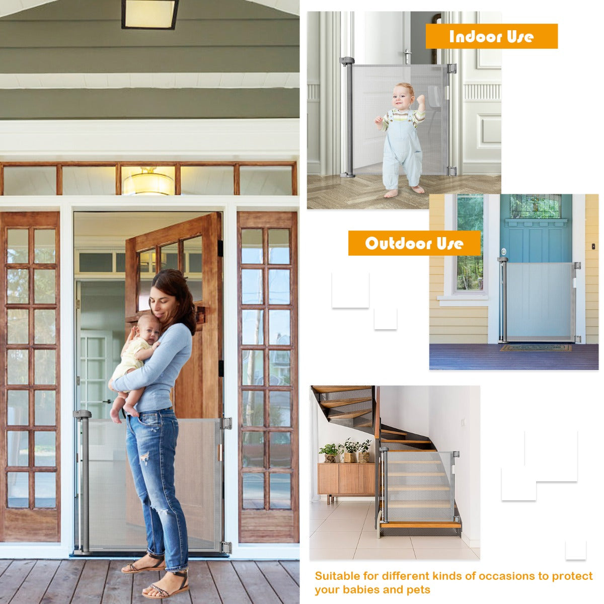 Your Kids’ Safety is First: The mesh safety gate is designed to block off your kids’ way out or in, which provides a safety solution for your kids by protecting them from dangers. Lock the mesh door and there is no need to worry that your kids would intrude into the kitchen, stairs or other places without your company.