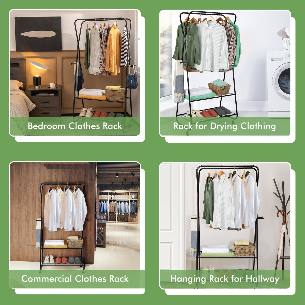 Our garment rack on wheels will be a perfect solution for those who need extra storage space for tons of clothes. This 3-in-1 multifunctional clothing rack includes 2 hanging rods, 2 metal shelves and 4 side hooks, providing large storage capacity for your clothes, hats, bags, shoes and other sundries. In this way, you can free your room from messy clutter. It's also worth mentioning that the heavy-duty metal with powder-coated surface is ultra sturdy and durable. The universal casters swivel smoothly, so you can easily transport clothes organizer around your home. And 2 lockable casters help you lock the garment rack in a breeze. Bullet Point: Organize Clothes Neatly: 2 Heavy-duty hanging rods provide double hanging space to display and organize your shirts, sweaters, long coats and dresses. 2-tier bottom shelves are great for storage baskets, blankets and shoes. More, there are 2 hanging hooks on each side, which enable you to hang hats, bags and scarfs conveniently. Rolling Casters for Easy Mobility: Equipped with 4 universal casters at bottom, and 2 of them are lockable, the garment rack strikes perfect balance between convenient mobility and reliable stability. You can move the rolling clothes rack anywhere you want with less effort. Versatile in Various Places: No matter if your home decoration is modern or industrial, this stylish metal clothing storage organizer always fits well. You can place it in the bedroom for daily suits, in the cloakroom for seasonal clothes or in the balcony for wet clothes. Sturdy Construction & Durable Material: Made of thickened metal, this clothing rack on wheels features excellent sturdiness and load-bearing capacity. Better yet, the surface is processed with powder coating which is capable of resisting rust, thereby serving you better and longer. Trouble of Assembly? Impossible!: The mobile garment rack comes with all necessary parts and a detailed instruction with clear illustrations, so you can put it together quickly and effortlessly. Features: 2 Hanging rods, 2 metal shelves and 4 hooks fulfill your storage demands Open design allows you to fetch what you need with ease 4 universal casters ensure smooth mobility 2 casters with brakes keep the rolling clothing rack in place Suitable for bedroom, entryway, cloakroom, balcony, etc. Sturdy and anti-rust metal for long-lasting service life Easy installation structure saves you time and effort Specifications: Colour: Black Material: Metal Overall Dimension: 86 x 45 x 170 cm (L x W x H) Net Weight:4.5 kg Weight Capacity of Each Hanging Rod: 10 kg Weight Capacity of Each Shelf: 10 kg Package Includes: 1 x Clothing Rack 1 x Instruction Box Qty:1(May vary by batch)