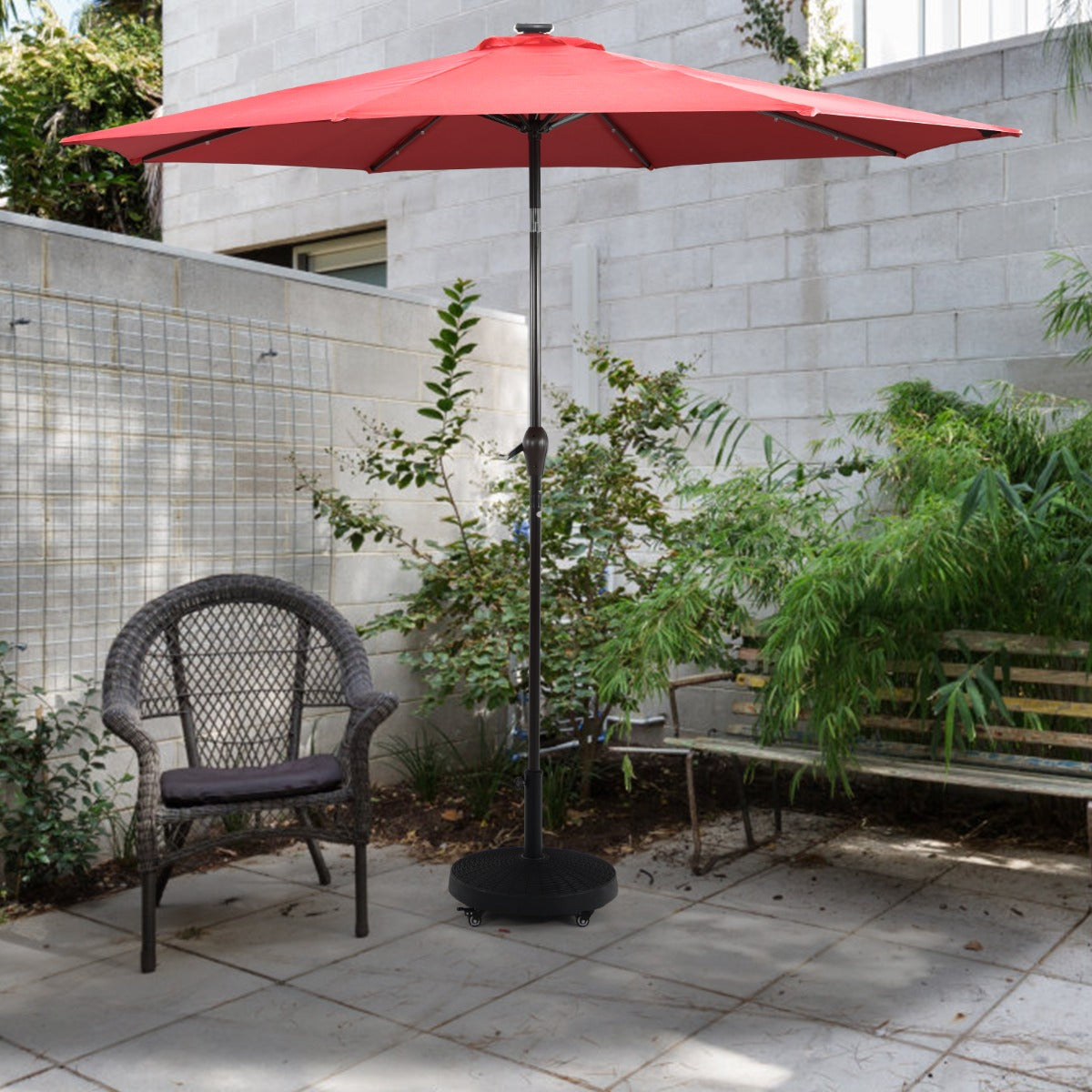 This resin umbrella base with lockable wheels is a fabulous companion for patio umbrellas.