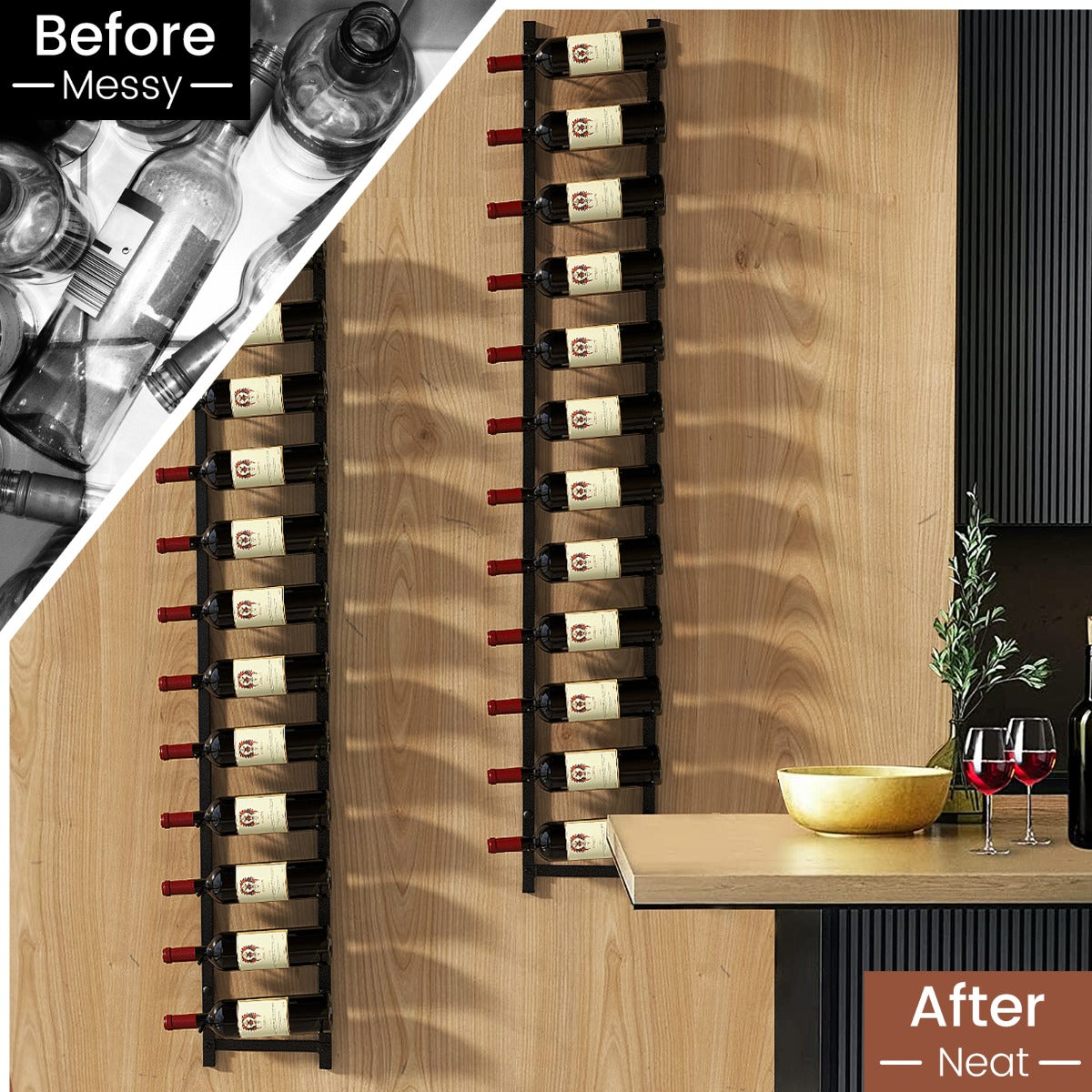 Are you still looking for a nice place to store your wine collection? Our 6/9/12 bottles wall wine rack will be an ideal wine storage option. After use, your wine can be well organized and neat. Wall-mounted design won't take up any floor space, which enables you to use it in any narrow space in your room. The durable metal pipes consist of the whole rack, which keeps it stable and safe to use. Additionally, this modern wall wine shelf with a stylish style can also fit well with any home decor. Plus, with a simple structure, you'll have this wall wine bottle holder assembled in a snap. The waterproof finish can also be cleaned easily. Bullet Point: 6/9/12 Wine Bottles Capacity: The whole wine rack can accommodate 6/9/12 bottles of wine. It will be a nice choice for wine lovers to place a wine collection to show their taste. Plus, the open design also ensures easy access. Space-saving Wall Mounted Design: It comes with all the needed screws to help you firmly fix our wine rack into the wall. Once fixation, our wall wine rack won't occupy any floor space, making it suitable for any small space. Stable & Rust-proof Metal Frame: Made of high-quality metal material, this metal rack is rust-proof and wear-resistant, which offers you long-lasting service life. Plus, with a low-profile rung design, this wine rack will store bottles safely and stably. Simple & Stylish Wine Display Rack: Combining modern elegance with wine storage function, this wall wine shelf is a wonderful addition to any home. You can use it in the kitchen, dining room, cellar or bar to display different wine bottles. Quick Installation & Product Size: The package contains a clear user manual and all required hardware for you to effortlessly finish assembly. After installation, the wine rack is 22 cm x 13.5 cm x 73/109/145 cm(L x W x H). Features: Space-saving wall-mounted wine rack for displaying wine bottles Features 6/9/12 bottles capacity Suitable for different wine bottles The modern and sleek design makes it a perfect decoration for your home Before use: messy, after use: neat Smooth finish for easy maintenance The easy-to-use design saves your energy Simple structure for easy and quick installation Specifications: Colour: Black Material: Metal Overall Dimension: 22 cm x 13.5 cm x 73/109/145 cm (L x W x H) Capacity: 6/9/12 Bottles Net Weight: 1 kg/1.5 kg/2 kg Package Includes: 1 x Wall Mounted Wine Rack 1 x Instruction Box Qty:1(May vary by batch)