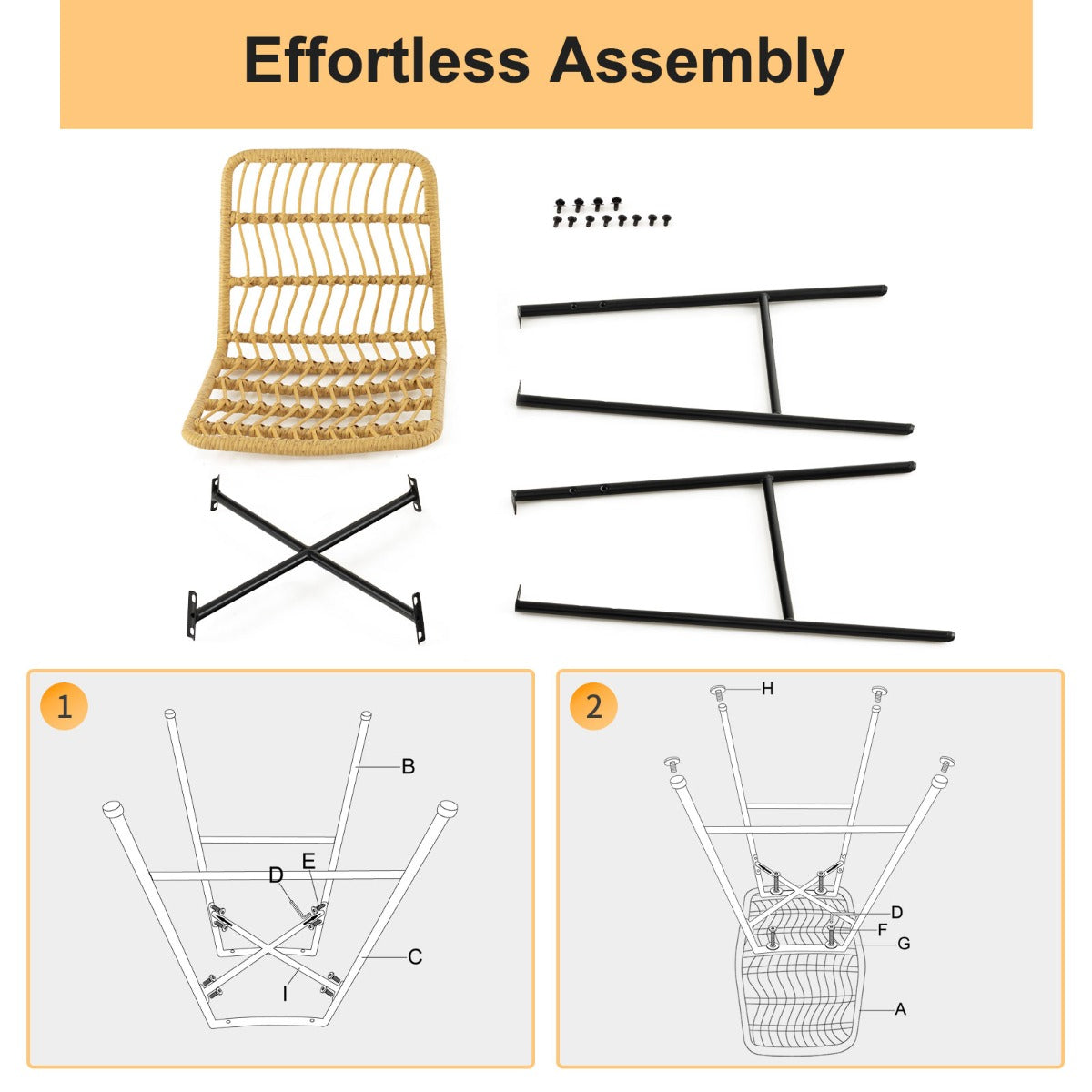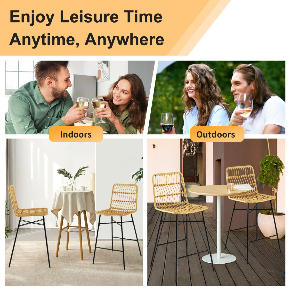 Enjoy leisure time anytime, anywhere with our rattan bar stools! The 69 cm seat heights allow you to use these bar chairs with your 89-99 cm counter top. After choosing the right place and suitable counter top, you can sit on these bar stools to feel how comfortable they are. Ergonomically designed with backrests and footrests, these bar stools are comfortable enough for complete relaxation. What's more, the hollow-out rattan makes you feel breathable even in the hot summer. Don't worry about the stability. The heavy-duty and rustproof metal frame will show you higher sturdiness. Bullet Point: Optimal Comfort: These bar stools are designed with wide backrests and large seats, which are cozy for sitting and leaning. Besides, the ergonomic footrests make you feel more comfortable. Inject a Modern Flair: The yellow PE rattan endows these bar stools with a modern style to blend your home decoration seamlessly. Meanwhile, the hollow-out design provides you with a breathable sitting experience. Stability Countered In Supported by reinforced and rustproof metal frames, these bar chairs not only hold up to 120 kg respectively but match outdoors as well. Moreover, the adjustable foot pads allow you to put these stools wherever you want. Fit 89-99 cm Counter Top: Measuring 69 cm in seat height, these rattan bar stools are suitable for counter tops with 89-99 cm. Whether you wanna refresh yourself in the morning or relax at night, these bar stools will always meet your needs. No Painful Assembly: The seats are pre-assembled. Just assemble the metal frame for time-saving and great convenience. The overall dimension of each stool: 56 x 49 x 104 cm (L x W x H). Features: Rest your feet on the ergonomic footrests Hollow-out design for breathability Comfortable to sit and lean with wide backrests and large seats Durable PE wicker for a long service time The sturdy metal frame is rustproof as well Keep these bar stools balanced with adjustable foot pads Make a modern addition to your home Suitable for indoors and outdoors Effortless assembly with clear instruction Specifications: Colour: Yellow and Black Material: PE Wicker, Metal Overall Dimension of Each Stool: 56 x 49 x 104 cm (L x W x H) Seat Height from the Ground: 69 cm Total Net Weight: 9.5 kg Weight Capacity of Each Stool: 120 kg Package Includes: 2 x Stools 1 x Instruction Box Qty:1(May vary by batch)