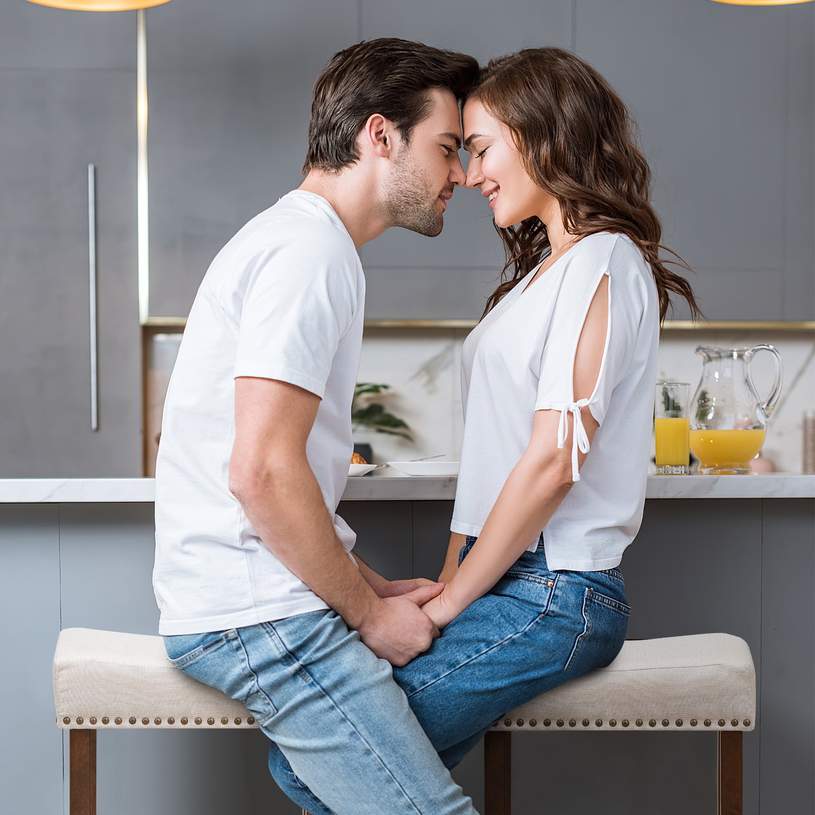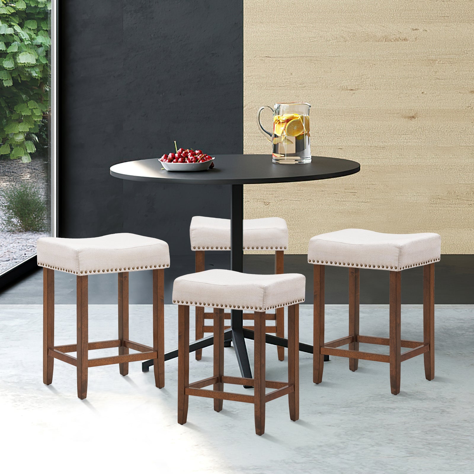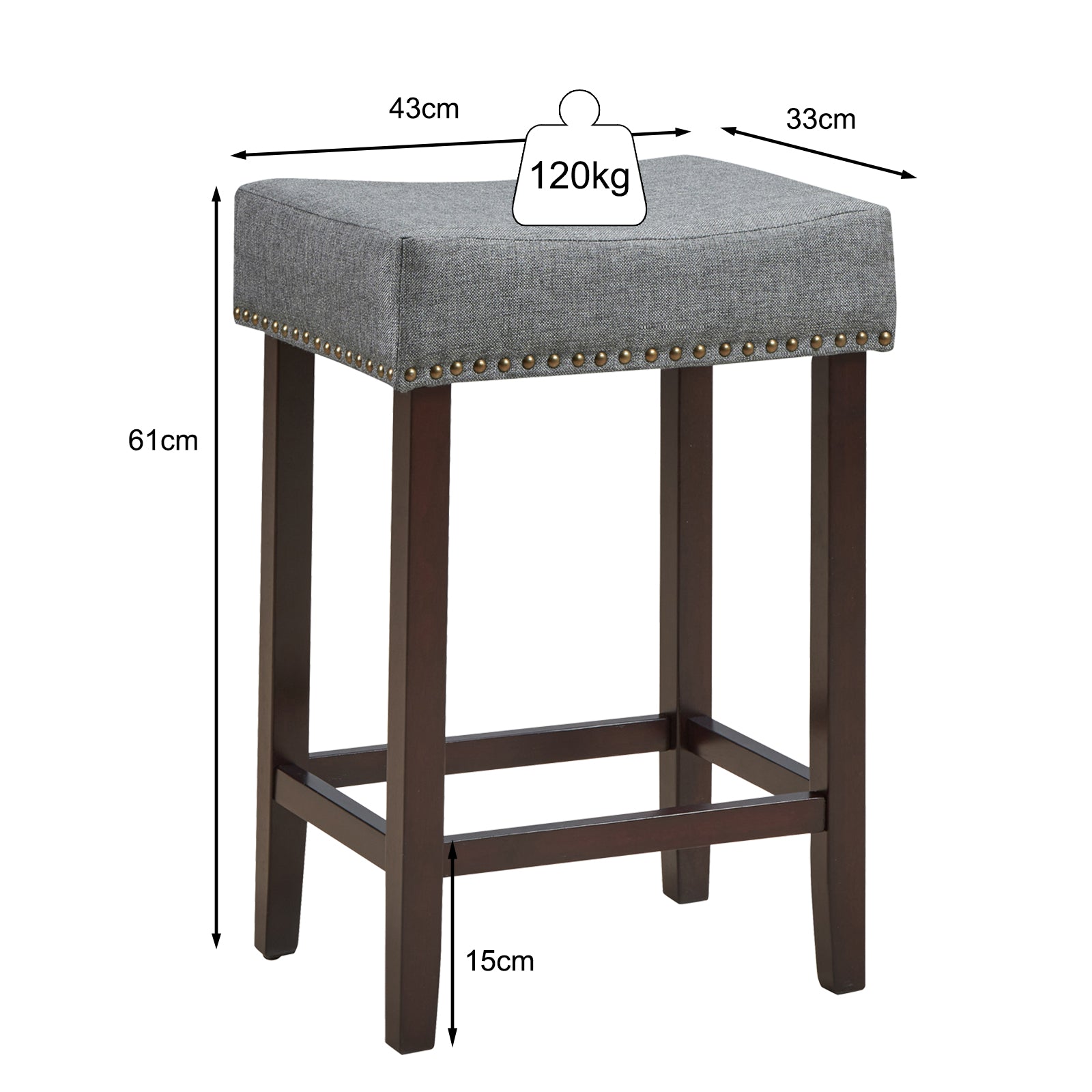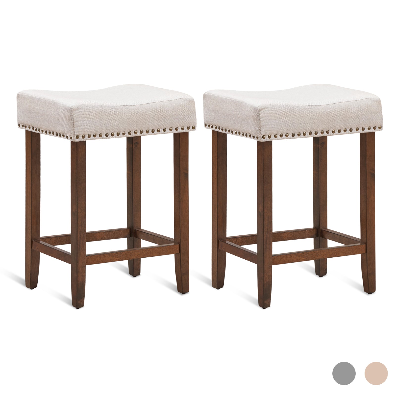 This is our brand new bar stools set, which is a great way to provide the comfort and relax for you.Made of solid rubber wood construction, these stools provide you years of durable use. The seats are firmly cushioned and equipped with the mixed linen and cotton fabric upholstery. Ergonomically saddle shape pluses feet pedals for much comfort. Classic nailhead studs are set around the stools, revealing the royal atmosphere. What’s more, these upholstered stools are pretty easy to assemble with our easy-to-follow instruction.With simple and elegant design, these stools are compatible with your home, bars, office etc.