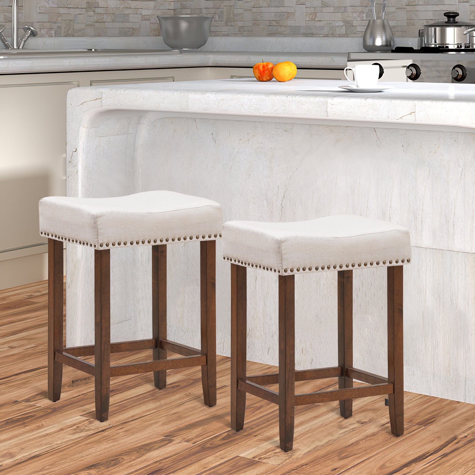 NNECW Set of 2 Saddle Barstools with Backless Nailhead Fabric Seat-White
