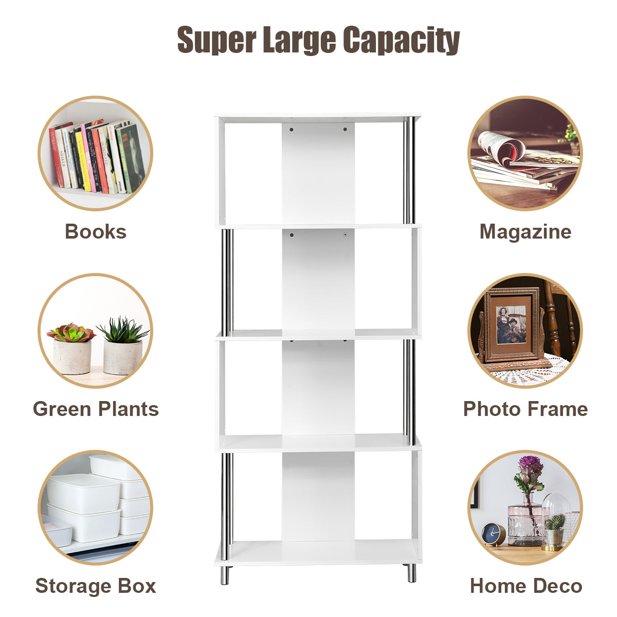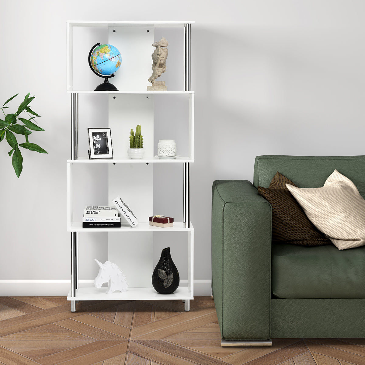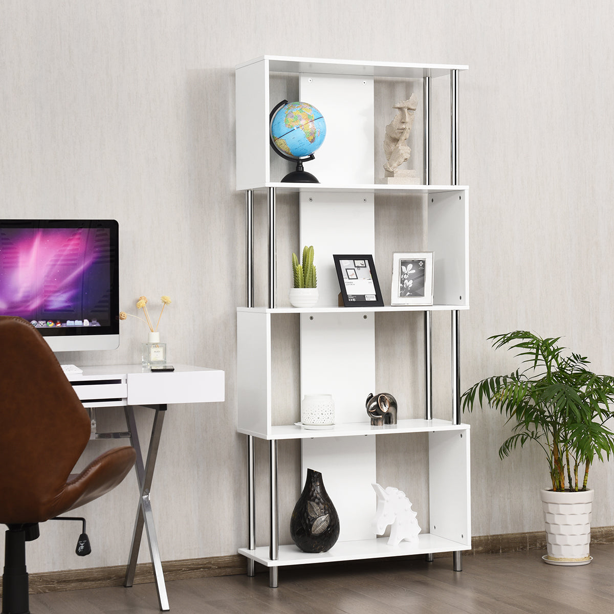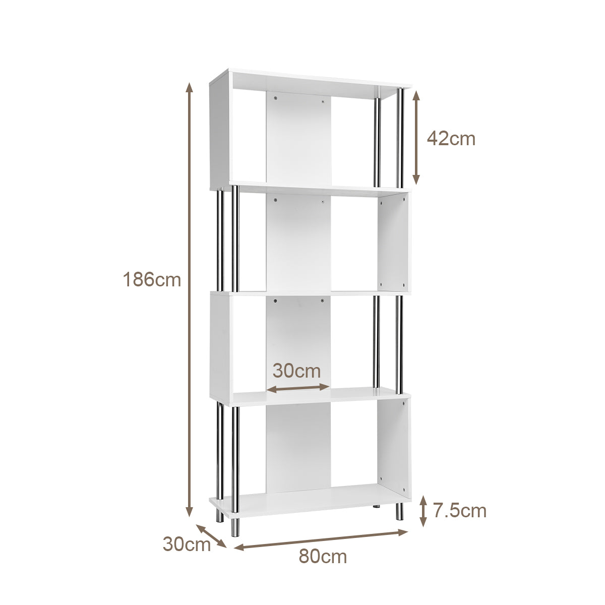 This attractive bookshelf combines wood and metal material artfully, show to an industrial character and artistic appeal feeling, pure white surface, the clean lines gives this bookcase a thoroughly modern fresh style. it meets the aesthetic of practicality and adds a lot of interest and particular charm to any room's interior. Snaking bookshelf with modern open concept design, four tiers large open shelf can display your books, CDs, DVDs, vases, photo frames, decorations and collectibles. It will be your best organizer to make your living room, bedroom, and office tidy, It is a good ornament that let your room full of fashion sense. Don’t hesitate to buy it now!