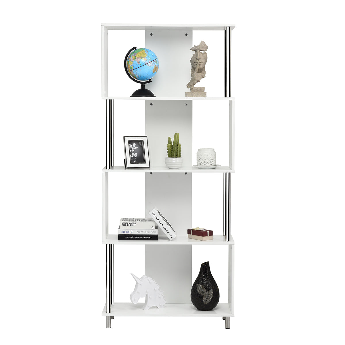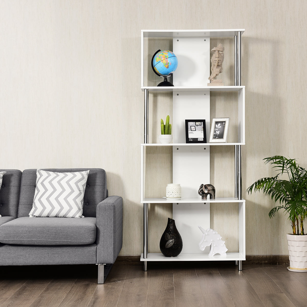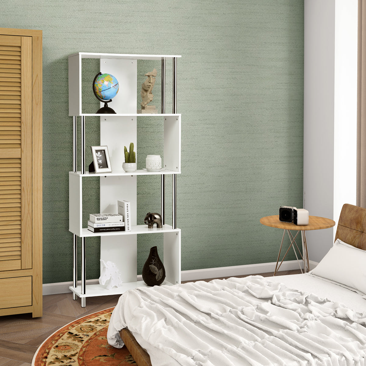 This attractive bookshelf combines wood and metal material artfully, show to an industrial character and artistic appeal feeling, pure white surface, the clean lines gives this bookcase a thoroughly modern fresh style. it meets the aesthetic of practicality and adds a lot of interest and particular charm to any room's interior. Snaking bookshelf with modern open concept design, four tiers large open shelf can display your books, CDs, DVDs, vases, photo frames, decorations and collectibles. It will be your best organizer to make your living room, bedroom, and office tidy, It is a good ornament that let your room full of fashion sense. Don’t hesitate to buy it now!