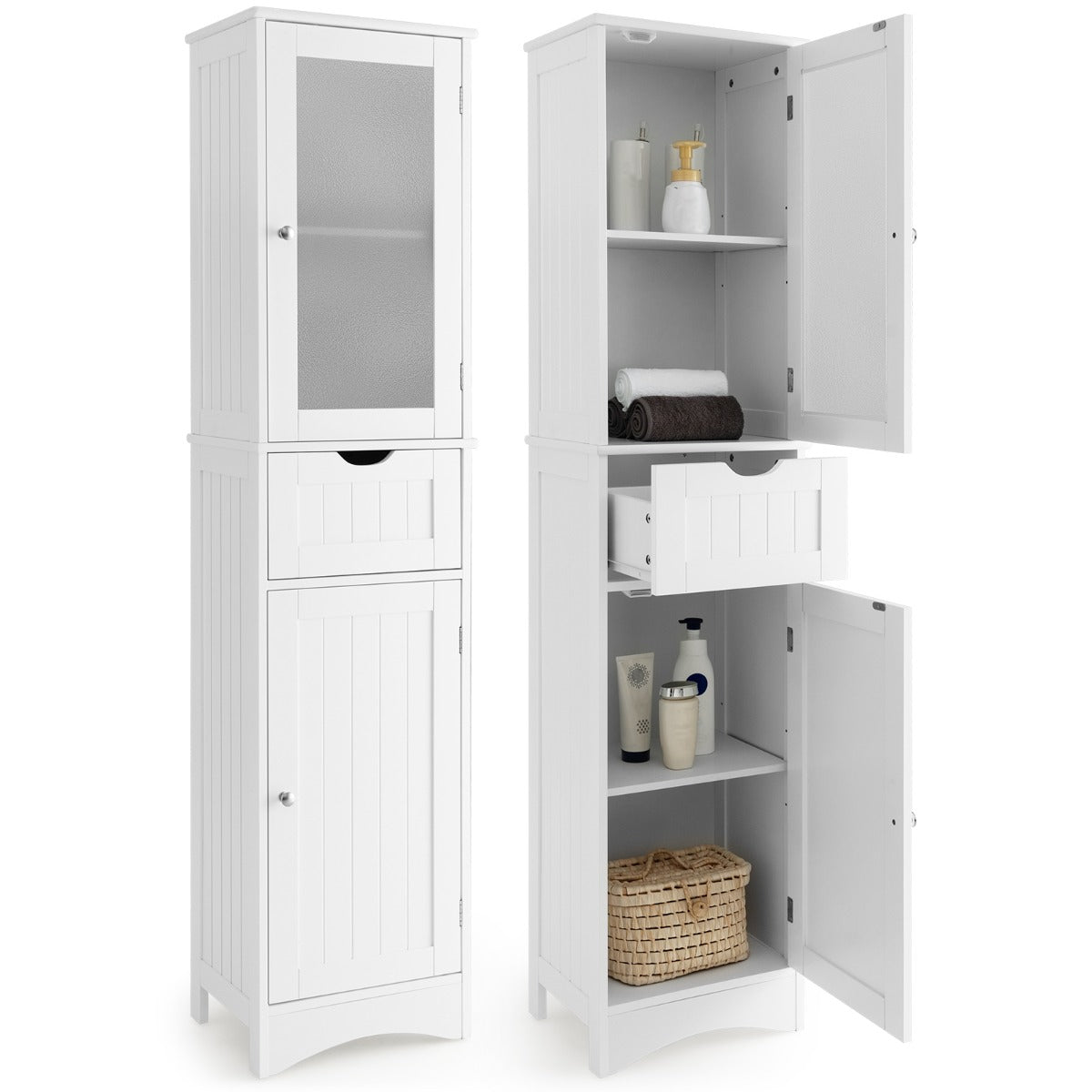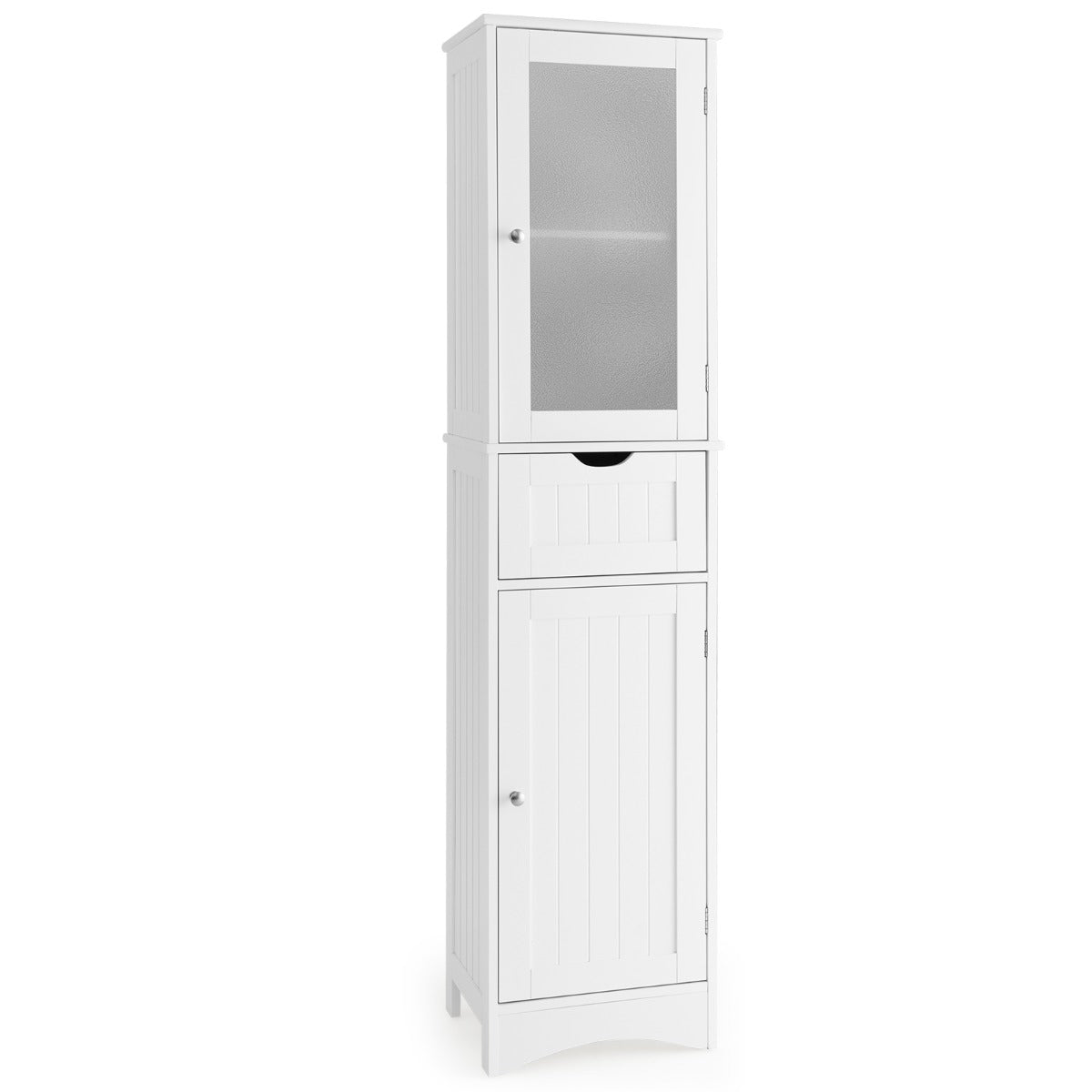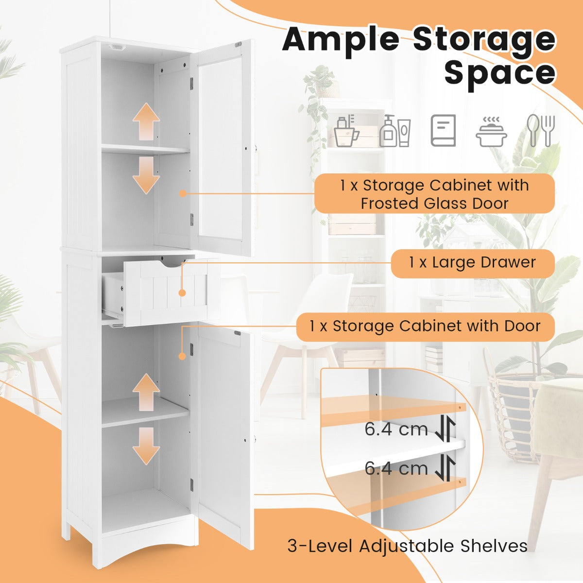 This slim and tall tower cabinet will be a great addition to a small bathroom, kitchen or corner in the living room, bedroom and more, which utilizes every inch in your space to create more storage space. Its simple and elegant look makes it a great decoration for your home. The frosted glass door is made of tempered glass which is not easy to break. The inside storage shelves have 3 adjustable heights, which meet your different storage needs. The cabinet doors are equipped with magnetic catches and the drawer is built with a smooth sliding rail. For increased safety, you can fix this bathroom storage cabinet to the wall using included anti-toppling device.