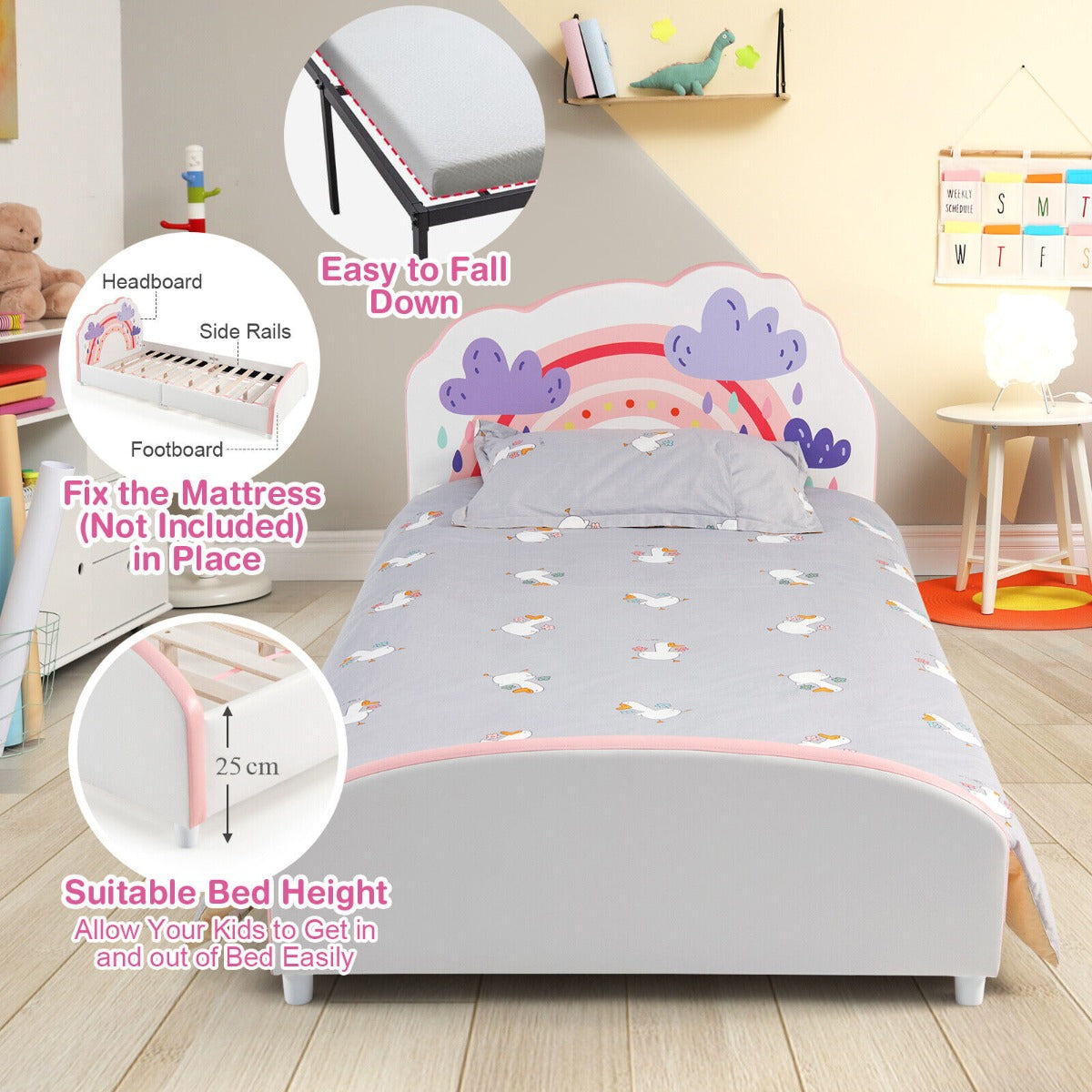 Kids-Friendly Height: The height of this twin-size bed to the floor is convenient for your little one to climb up or down without any help. The whole dimension of the bed: is 201 cm x 98 cm x 81 cm(L x W x H). Fits a standard twin mattress (not included). Suit for kids over 3 years old.
