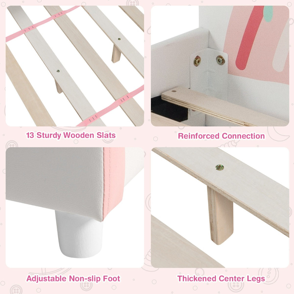 Upholstered Twin Bed: This adorable kids' twin bed features a soft padded headboard & footboard and is covered by waterproof PVC which is convenient to wipe clean. Breathable high-density sponge padding on the headboard ensures long-lasting comfort and support for little ones while sitting up to read or watch TV.